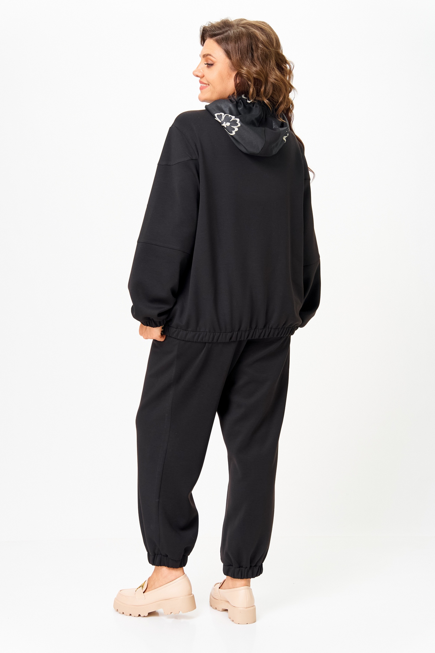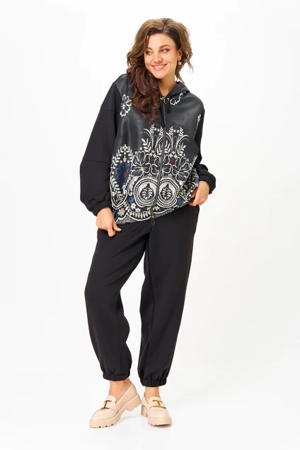 Костюм женский спортивный, состоящий из куртки и брюк. Костюм выполнен из 2-х видов ткани. Куртка с капюшоном свободного кроя на талии с прорезными карманами, застежка молния.Низ рукавов и низ куртки на эластичной манжете. Брюки заужены к низу, с карманами. Брюки на резинке по талии. Низ брюк на манжете с резинкой.