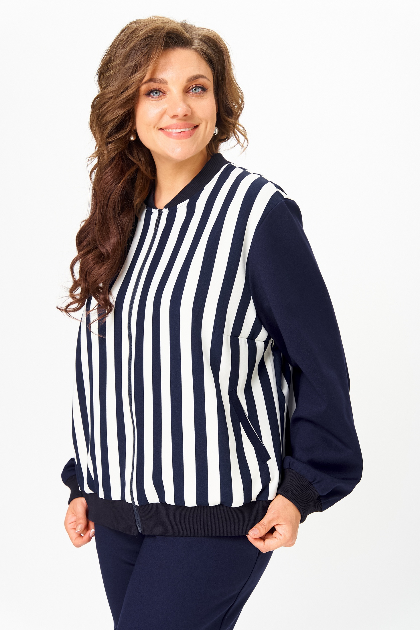 Костюм женский спортивный, состоящий из бомбера и брюк. Легкий джемпер-бомбер, предназначен для молодых и стильных женщин. Выполнен из двойной костюмно-плательной ткани, по передним полочкам выполнены прорезные карманы. Стойка-воротника выполнена из ткани кашкорсе, из этой же ткани выполнены манжеты на рукавах. По центру изделия молния.