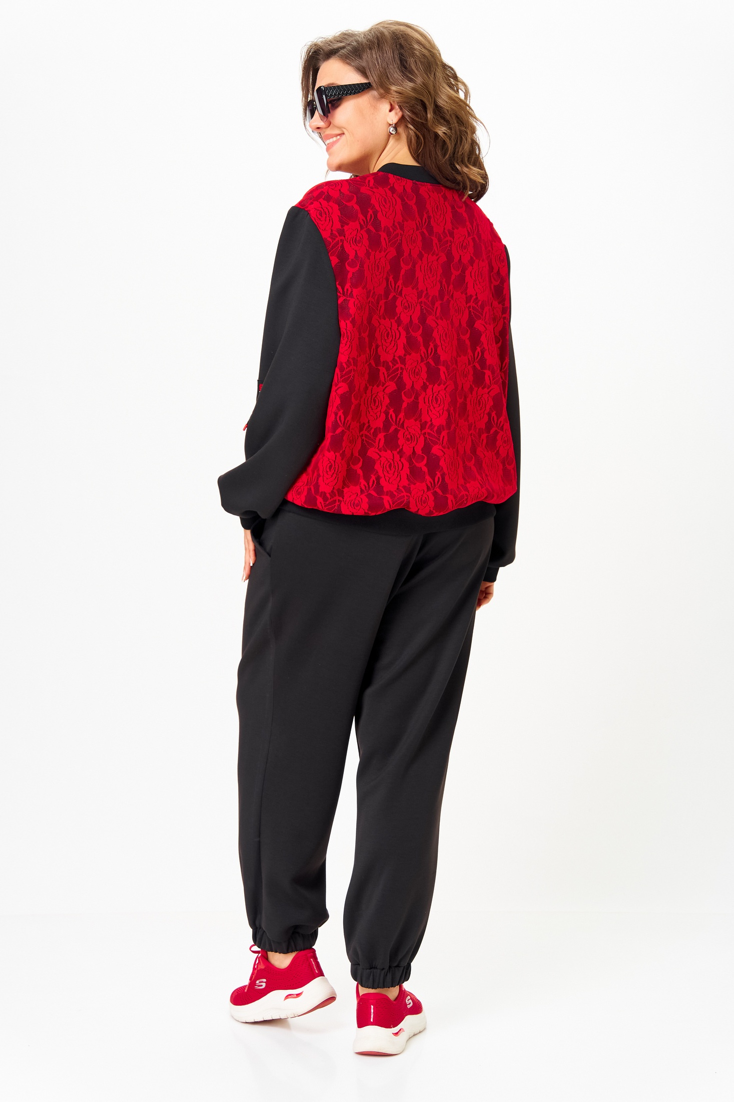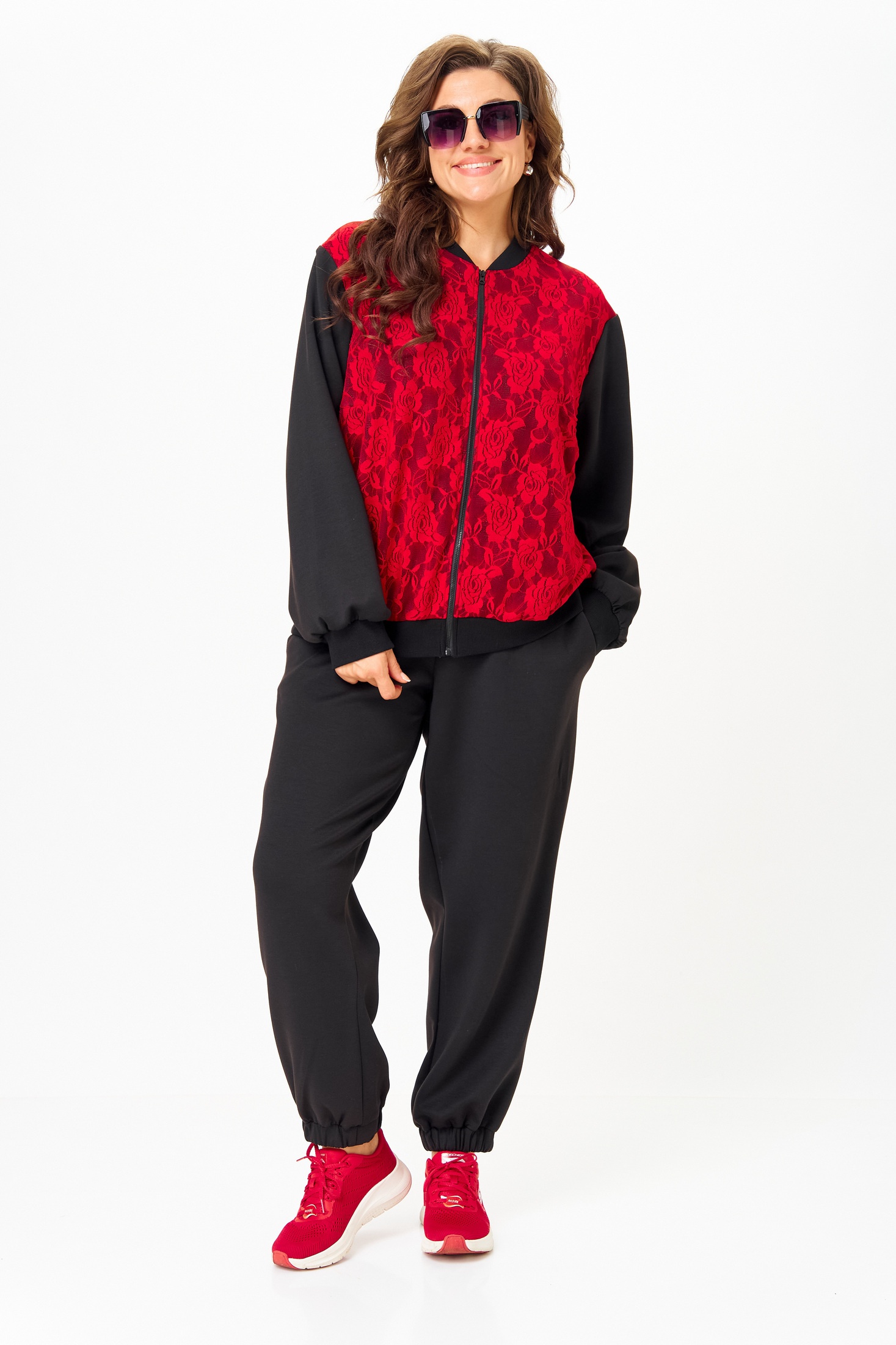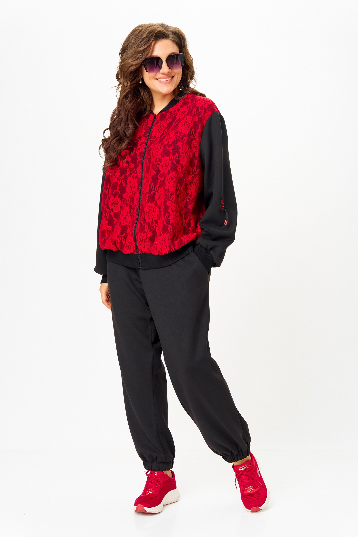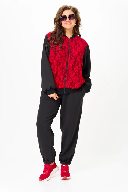 Костюм женский спортивный, состоящий из бомбера и брюк. Легкий джемпер-бомбер, предназначен для молодых и стильных женщин. Выполнен из двойной костюмно-плательной ткани. Перед и спинка выполнены из гипюра. Стойка-воротника выполнена из ткани кашкорсе, из этой же ткани выполнены манжеты на рукавах. По центру изделия молния. Украшением изделия служит нашивка на рукаве.