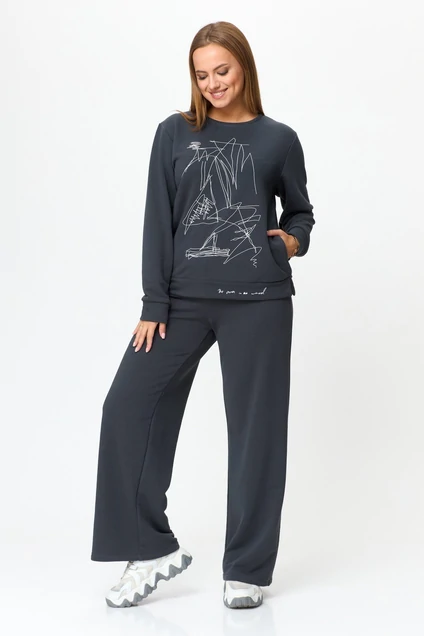 Комплект женский, двухпредметный, состоящий из свитшота и брюк. Свитшот со спущенным рукавом, с круглой горловиной, с планк0й по низу. Рукав на манжете, по переду принт-печать,в боеовых швах карманы. Брюки прямые к низу, пояс на резинке.
