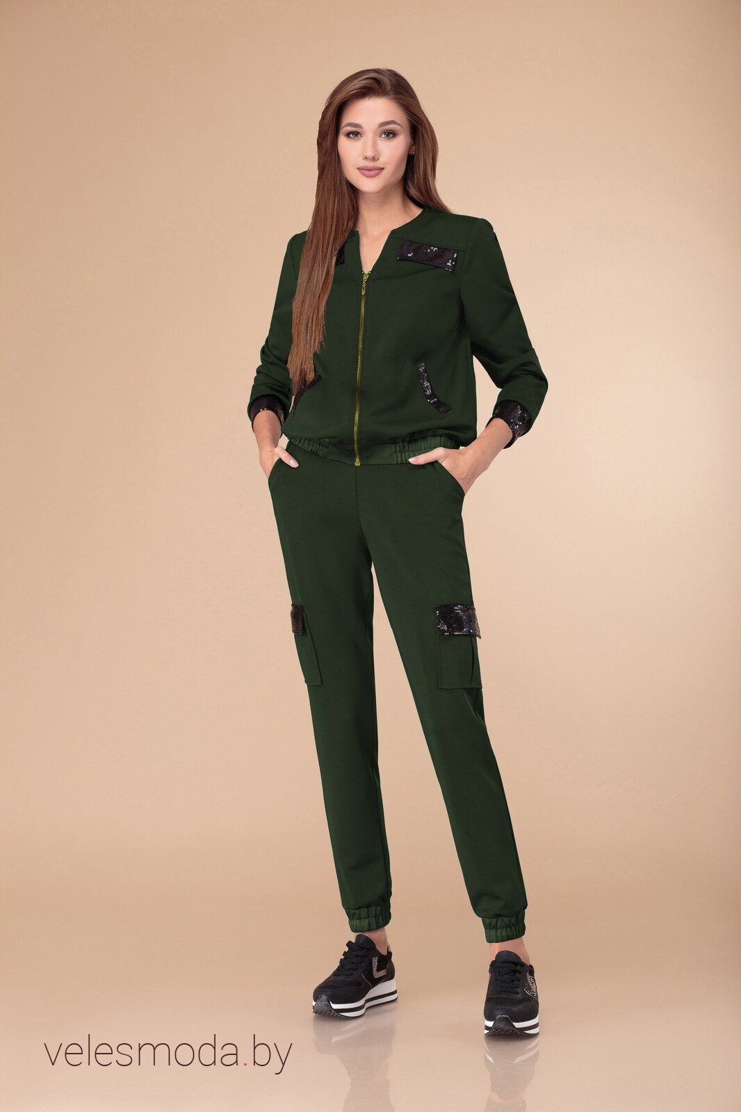 Костюм женский, состоящий из жакета и брюк. Жакет прямого силуэта втачного покроя. Застежка на молнию. По переду отрезная кокетка с отделочными клапанами и прорезные карманы с листочкой. Пояс жакета на резинке. Брюки на манжете, пояс на резинке. На брюках два косых кармана. Вверху и выше колен по два накладных кармана. Длина жакета по центру спинки в 44 размере 58 см Длина рукава 60 см Ширина под проймой 47 см Ширина брюк на уровне бедер 46 см Длина брюк 99 см