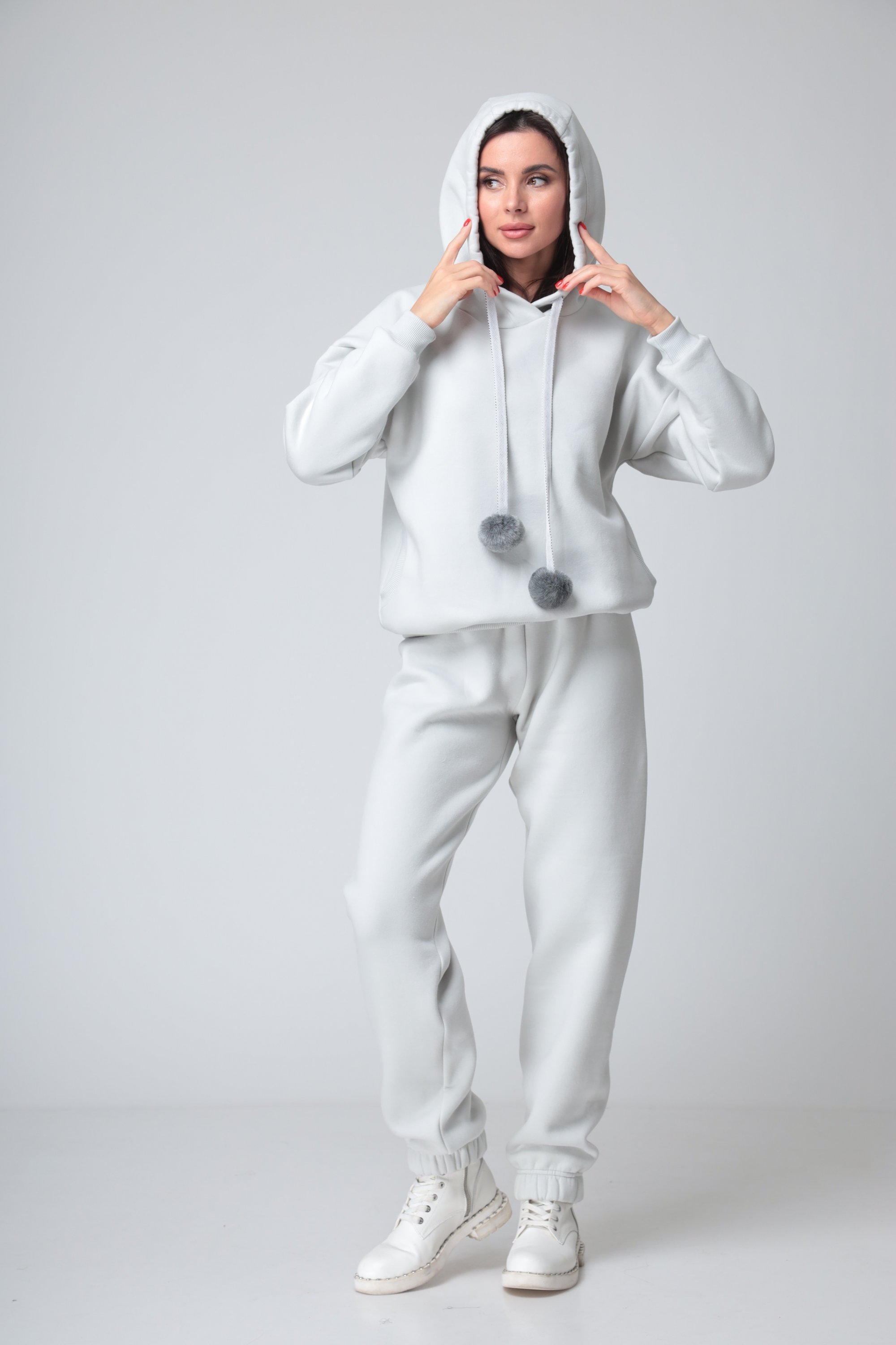 Рукав длинный с манжетой. По низу худи и низу рукава манжетка из плотного «кашкорсе». Мягкие пушистые помпоны на шнуре создаютют настроение зимнего отдыха