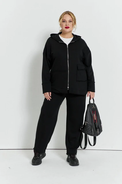 Костюм из толстовки с капюшоном и брюк. Толстовка с застёжкой на молнию, накладными карманами спереди и на спинке. Спинка с кокеткой и ассиметричными рассечениями, в одном из которых вставлена молния. Длина по спинке ок. 74 см.