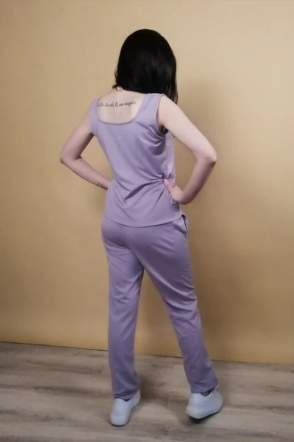 Спортивная одежда давно вышла за пределы спортивного зала и успешно закрепилась в повседневной жизни. Предлагаем вам спортивный костюм из трех изделей: топ, брюки, кардиган. Топ полуприталенного силуэта, с квадратным вырезом по спинке и по переду. Широкие бретели дополняют спортивный стиль. Трикотажные брюки свободного силуэта, зауженные к низу пояс на резинке. По боковым швам лампасы, в тон основного изделия. На уровне бедер карманы. Кардиган до середины бедра, широкая пройма не сковывает движений, Кардиган застегивается на пуговицы. Длина брюк по боковому шву - 106 см, длина топа от плеча - 58см, длина кардигана от плеча - 85 см., длина рукова от плеча - 65 см.
