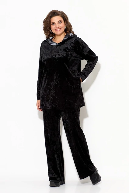 Нарядный брючный костюм в спортивном стиле выполнен из трикотажного велюра. Джемпер прямого силуэта со спущенной проймой, длинными рукавами, горизонтальным подрезом пл переду и оригинальными карманами в боковых швах. Брюки широкие, на притачном поясе с резинкой.
