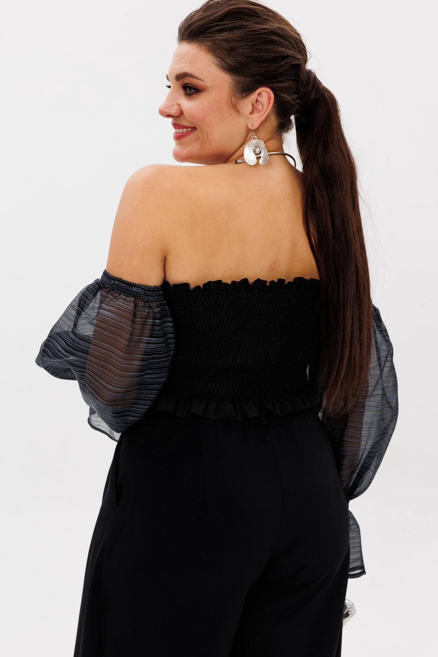 Эффектные сборчатые рукава можно носить классически на плечах или спустить их, создав соблазнительный образ с загадочным акцентом на зоне декольте.