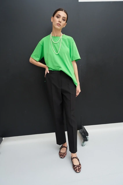 Футболка прямого свободного кроя со спущенным рукавом.