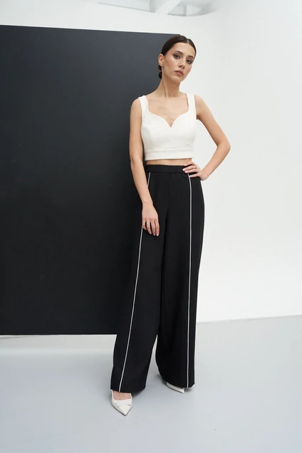 Топ на широких бретелях выполнен из полотна в теплом белом цвете Характеристики: укороченный, фигурный вырез горловины, широкие бретели, по переду изделия вытачки, сбоку изделия потайная молния