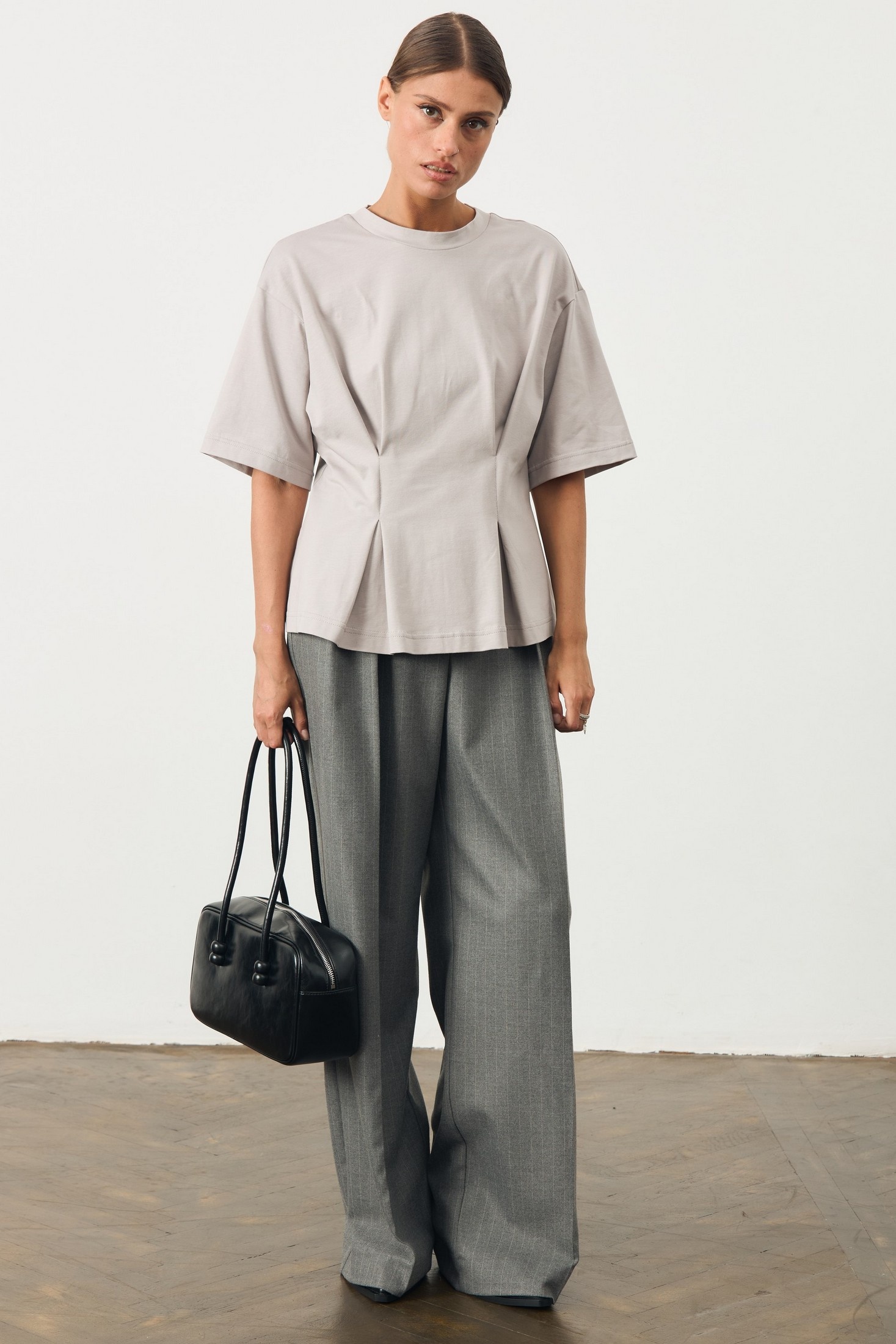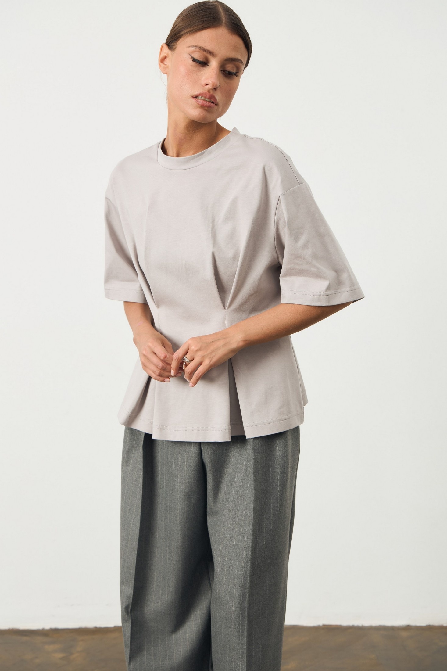 Эта стильная футболка серого цвета - находка для модного гардероба. Она выполнена из качественного материала в приталенном крое, который подчеркивает фигуру. Особенности дизайна включают спущенные рукава средней длины, придающие образу расслабленный вид. Привлекательный акцент на передней части в виде изящных складок добавляет текстуру и объем. Эта футболка идеально сочетается с элементами как повседневного, так и делового стиля.