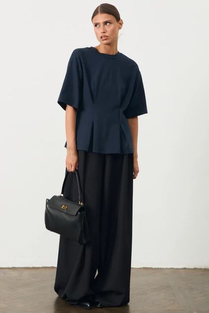 Футболка приталенного кроя со спущенным рукавом. По переду декорирована складками