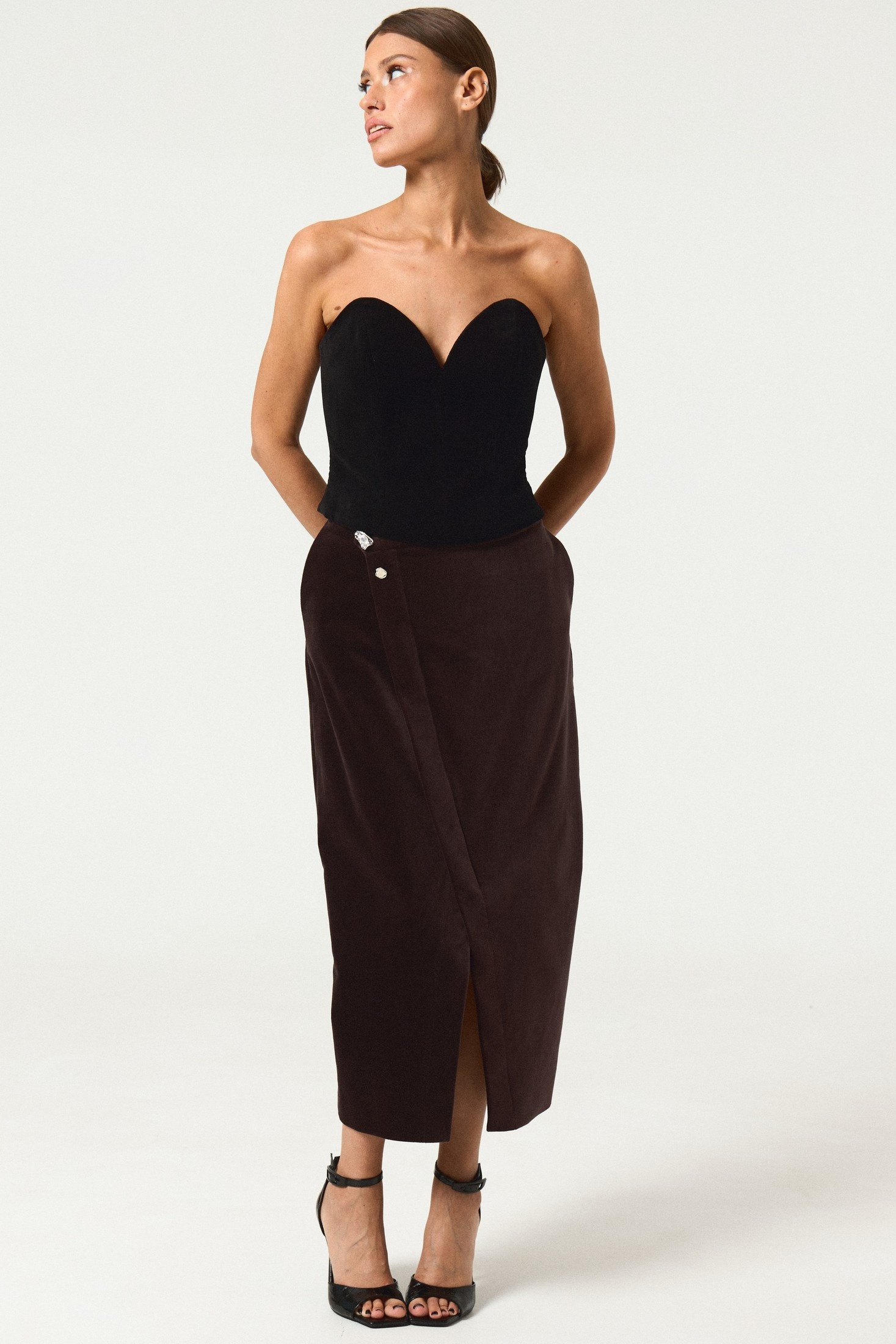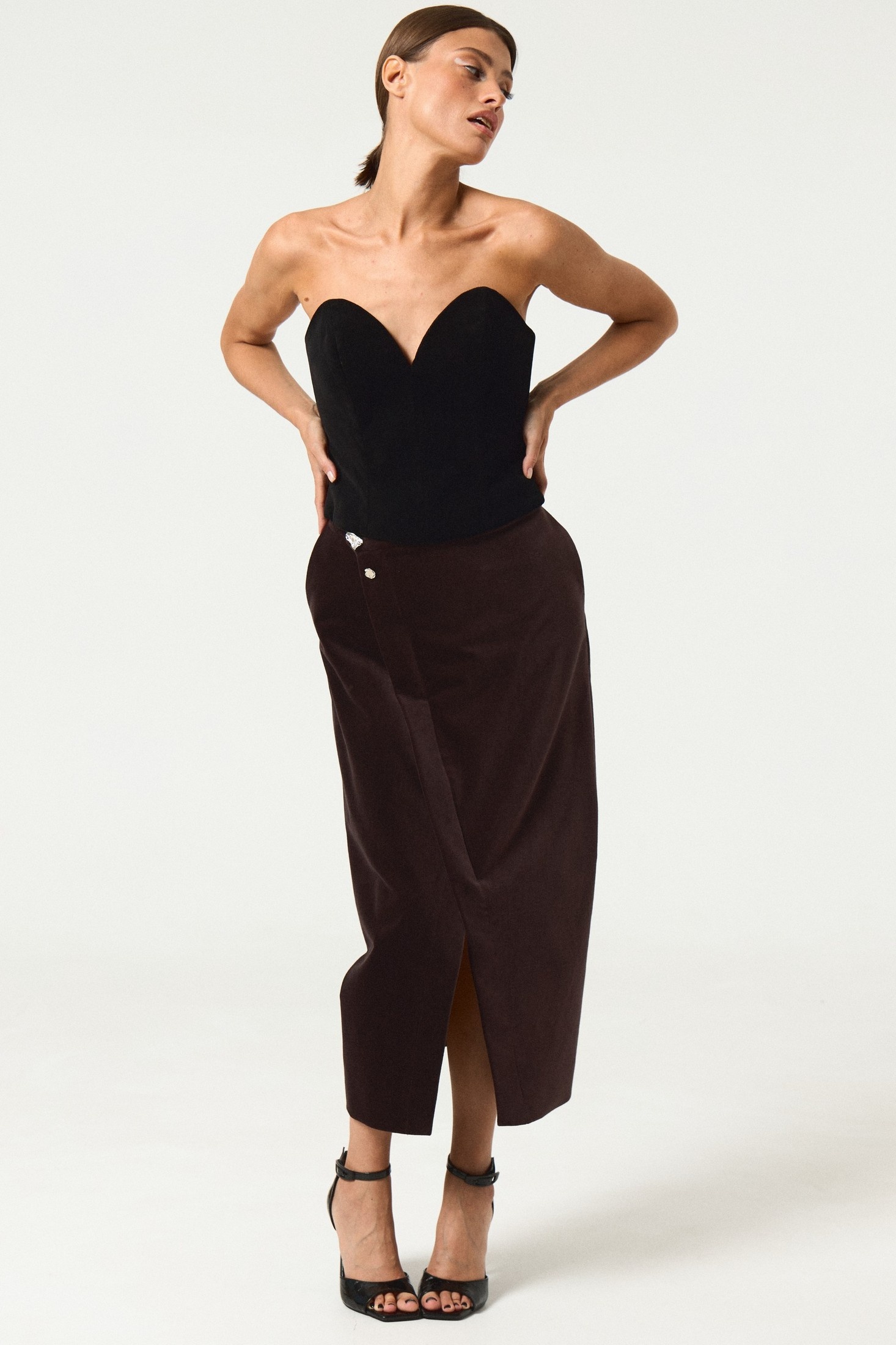 Элегантный топ черного цвета, выполнен в корсетном стиле, идеально подчеркивает фигуру. Изготовлен из качественной хлопковой ткани с перламутровым напылением, который придает изделию легкий блеск. Модель с сердцевидным вырезом добавляет изысканности, а застежка на разъемную металлическую молнию на спинке обеспечивает удобное использование. Этот топ будет идеальным выбором для создания стильного вечернего образа.