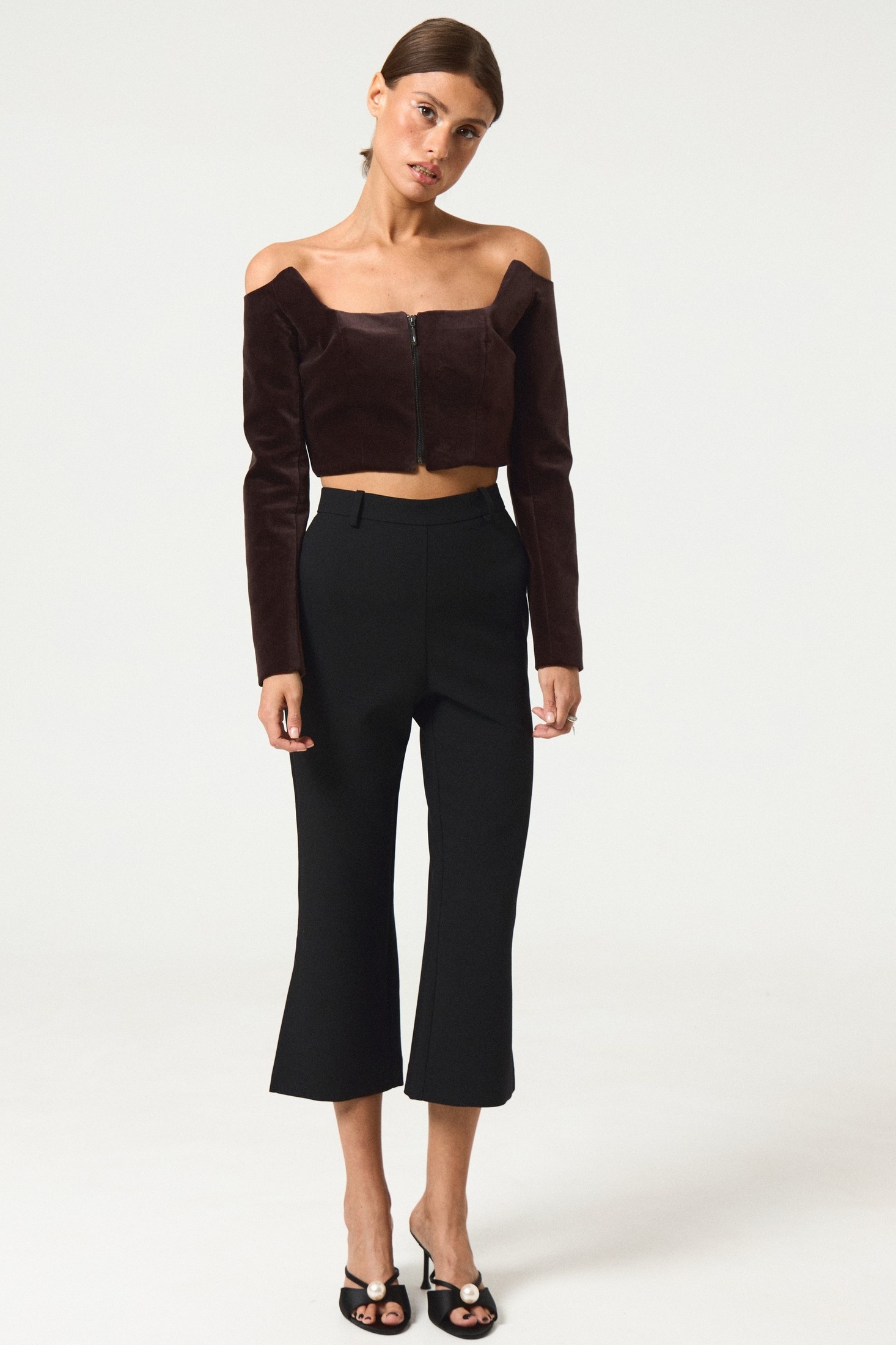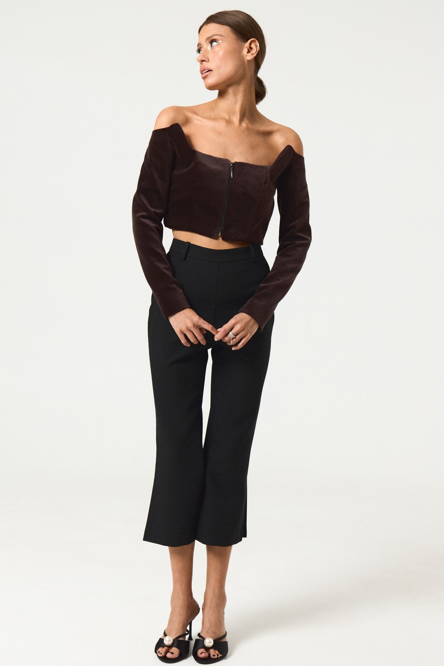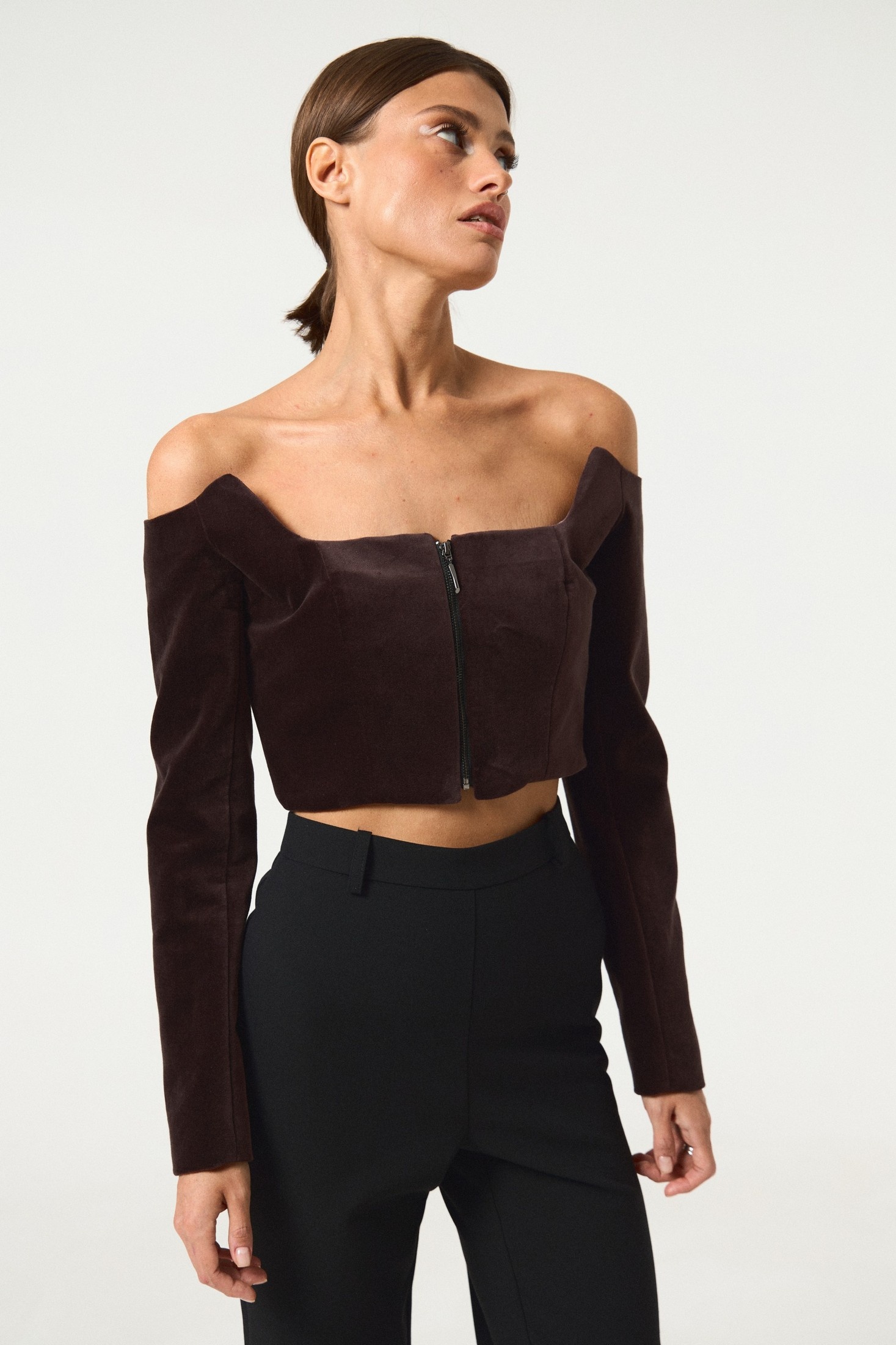 Элегантный коричневый топ из бархата прилегающего силуэта. Модель с длинными рукавами и фигурным вырезом на передней части и спинке. Дизайн дополнен передней застежкой на молнию, что добавляет изделию изысканности и практичности. Идеален для создания стильных и современных образов.