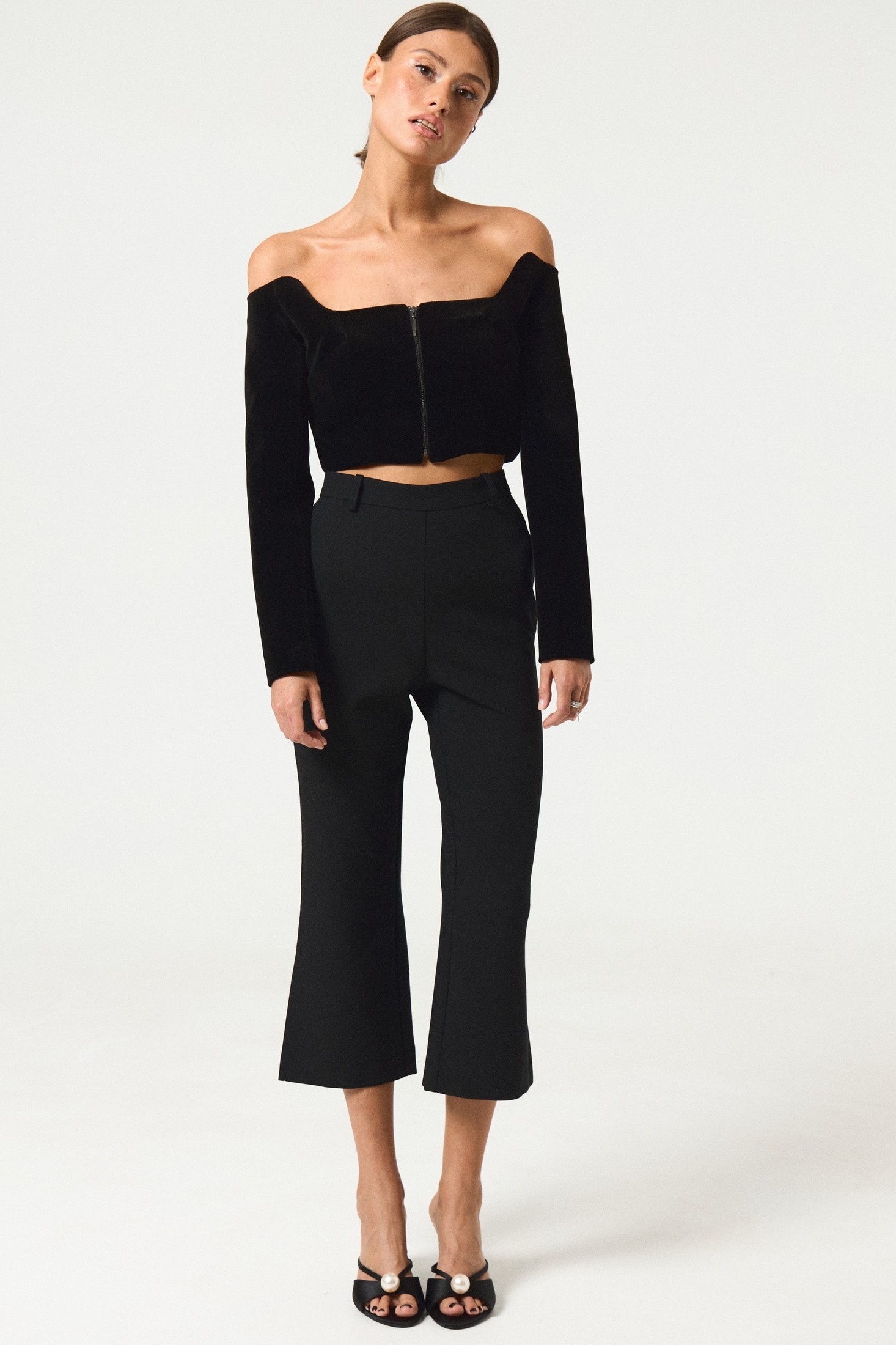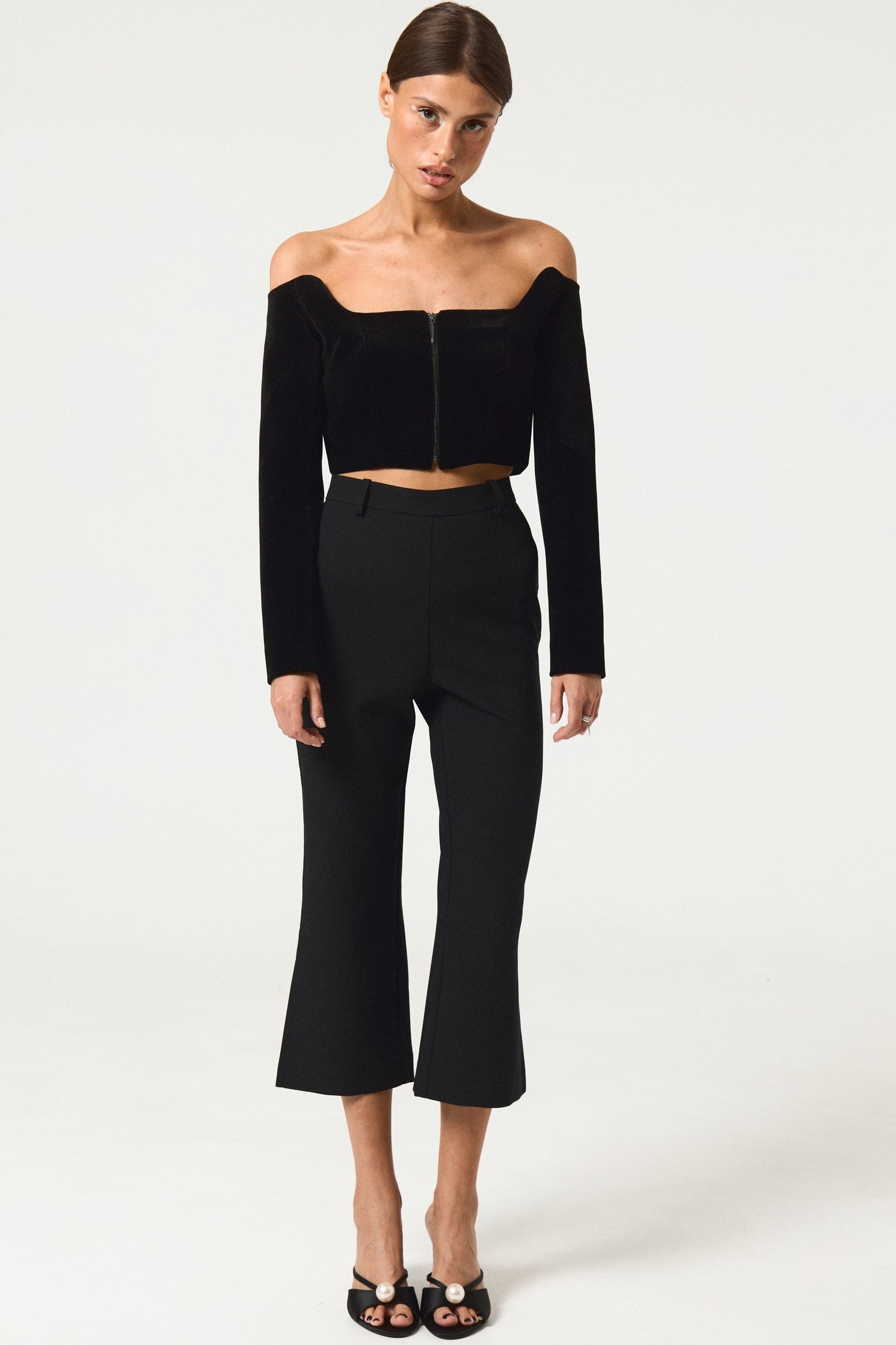 Элегантный черный топ выполнен в прилегающем силуэте. Особый акцент этой модели — фигурный вырез, эффектно оформленный как на передней, так и на задней части. Длинные рукава добавляют изысканности образу. В качестве удобной и стильной детали предусмотрена застежка на молнию спереди. Этот топ идеально подойдет для создания современного и привлекательного образа.