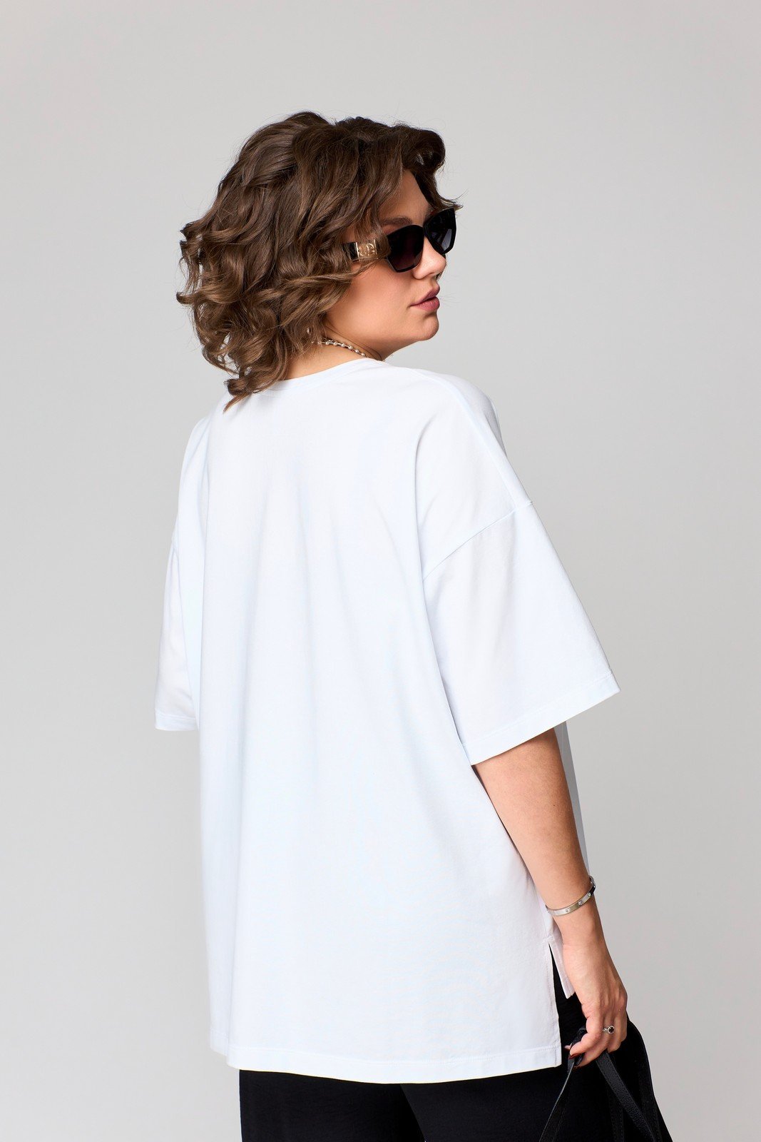 Откройте для себя нашу стильную футболку OverSize, предназначенную для элегантного комфорта. Эта модель единого размера подходит для размеров 54-66 и создана специально для женщин с формами. Белая футболка выполнена из высококачественного мягкого хлопка PREMIUM класса и оснащена свободным кроем, что делает её идеальным выбором для скрытия недостатков фигуры. Дизайн усилен эффектным черно-белым принтом в виде зебры на груди, добавляя изюминку в повседневный образ. Спущенные плечи и удлинённые рукава эффективно маскируют полноту рук, обеспечивая чувство уверенности. Эта футболка станет незаменимым элементом вашего гардероба, идеально сочетаясь как с брюками, так и с юбками. Непревзойденный выбор для тех, кто ценит комфорт без ущерба для стиля.