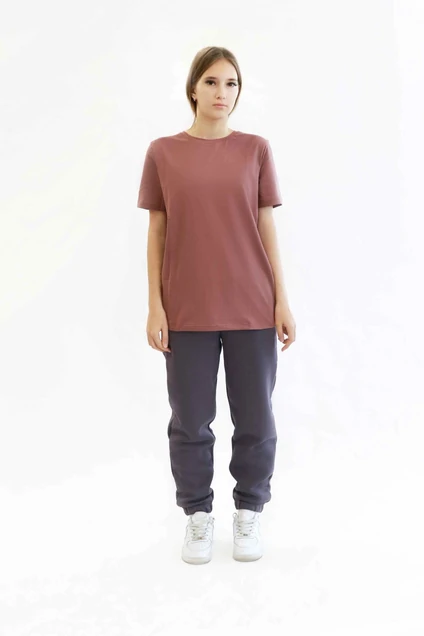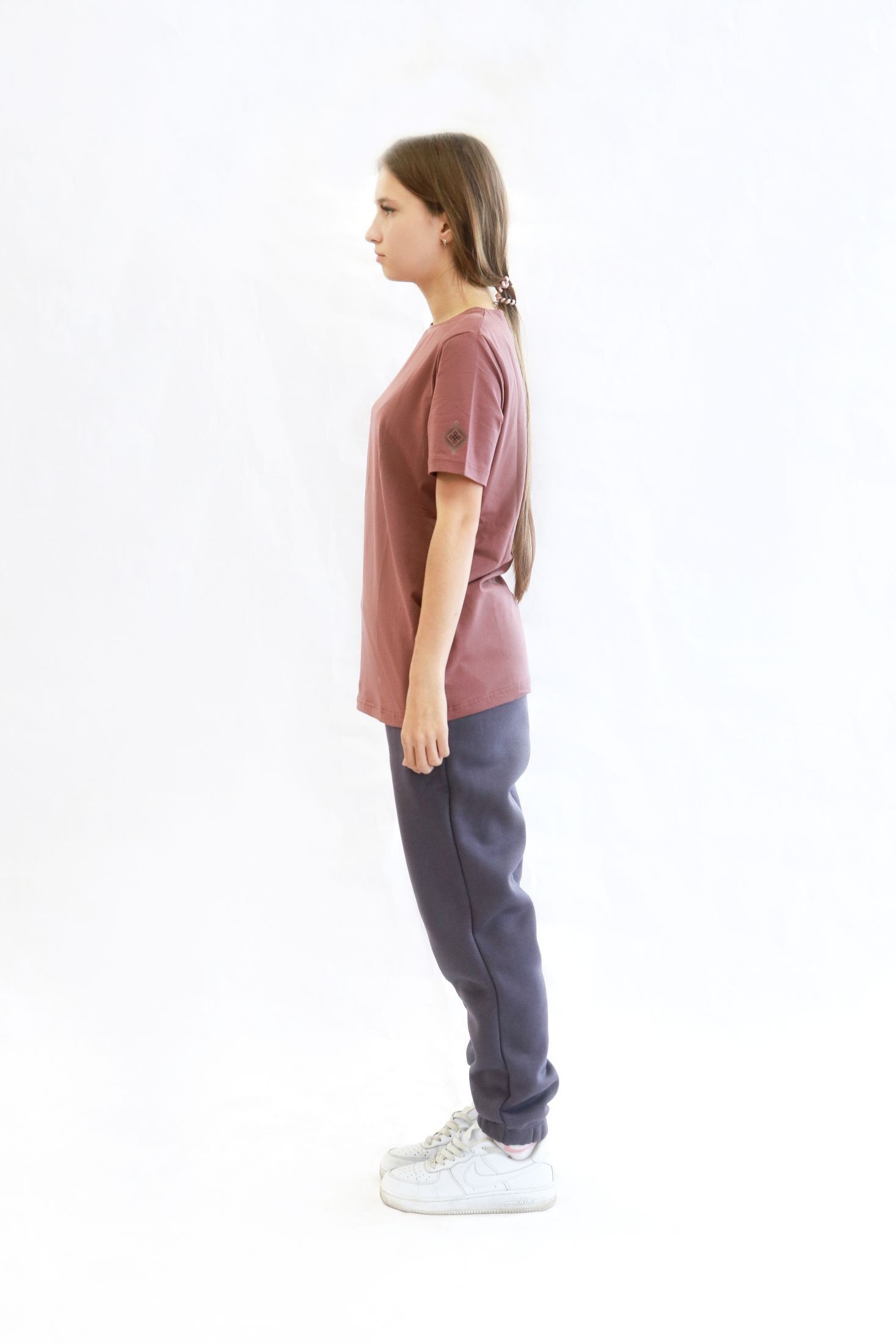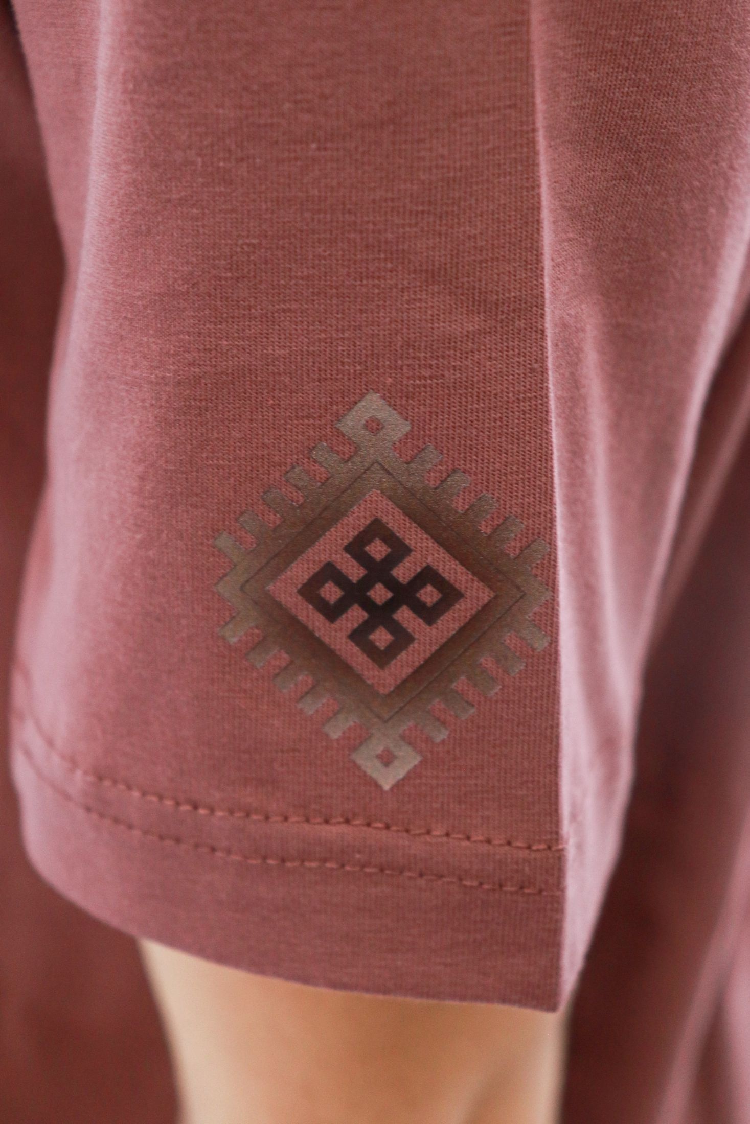 Элегантный джемпер терракотового цвета с округлым вырезом и короткими рукавами. На одном из рукавов в качестве акцента выполнен элемент с национальной символикой. Простой и стильный, этот джемпер идеален как для повседневной, так и для спортивной одежды.