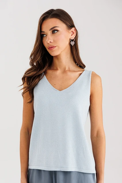 Джемпер трикотажный с блеском, без рукавов. По переду и спинке V-образный вырез. По спинке сердце с гравировкой BUTER.