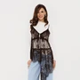 Блузка из кружева без подкладки на регулируемых бретелях и асимметричным низом. Полочка с V-образным вырезом и центральной застежкой на завязки. По горловине, пройме и спинке вверху вставлен волан со сборкой. По полочке и спинке настрочены рюши горизонтально.