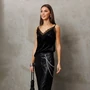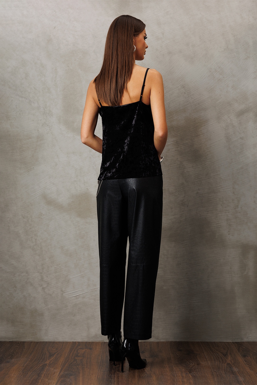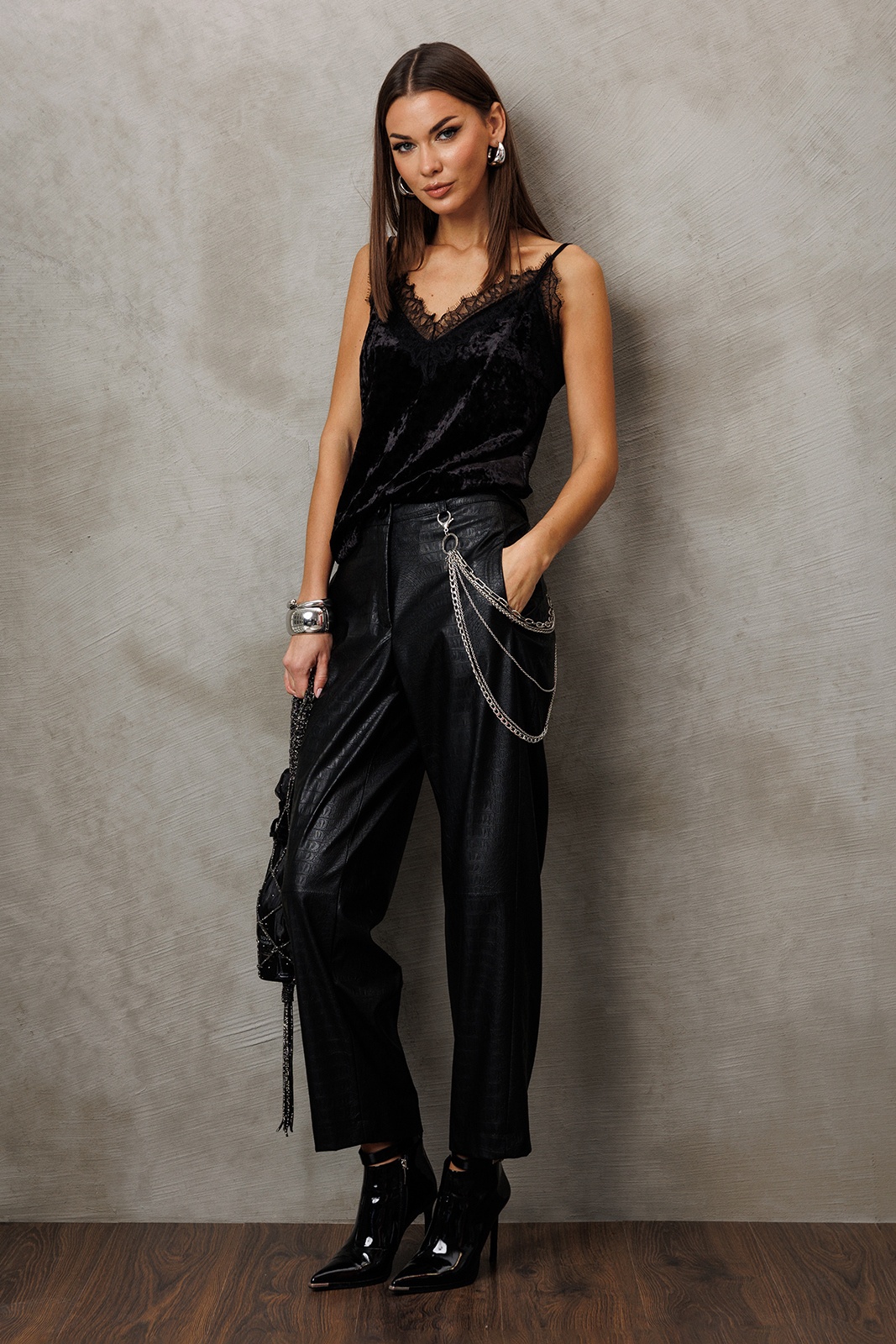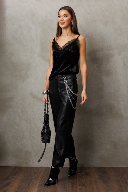 Элегантный топ из черного велюра, добавляющий изысканность любому образу. Изделие отличается V-образным вырезом, украшенным чувственным кружевом, которое повторяется и на нагрудной вытачке. Модель на регулируемых бретелях, выполненная на широкой обтачке, обеспечивает идеальную посадку. Этот полуприлегающий силуэт топа идеально подчеркивает фигуру, делая акцент на изяществе и стиле.