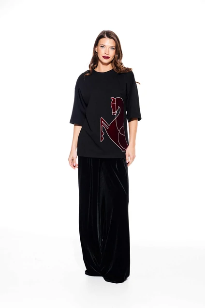 Элегантный женский джемпер черного цвета, выполненный из мягкого трикотажа. Модель прямого свободного силуэта с круглым вырезом горловины обеспечивает комфортное ношение. Особый акцент джемпера – это выразительная вышивка-аппликация в виде лошади, выполненная из бархата на передней части. Джемпер отлично сочетается с различными элементами гардероба, придавая образу стильный и законченный вид.