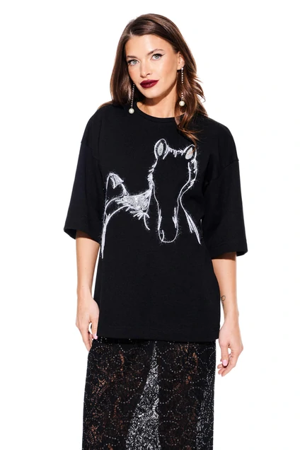 Элегантный женский джемпер черного цвета из мягкого трикотажного полотна представляет собой идеальное сочетание комфорта и стиля. Дизайн джемпера прямого силуэта дополнен круглой горловиной и свободным кроем, обеспечивающим идеальную посадку и свободу движений. Изысканный акцент на передней части джемпера – контрастная вышивка с изображением лошади, добавляющая уникальности и шика. Длинные рукава и цельнокроеная передняя и задняя части подчеркивают лаконичность и изысканность модели. Этот джемпер станет превосходным выбором как для повседневного, так и для более торжественного образа.