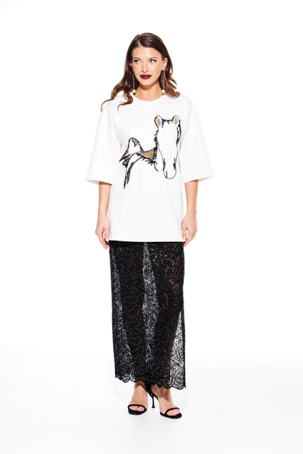 Элегантный белый джемпер из мягкого трикотажного полотна представляет собой идеальное решение для создания как повседневного, так и более торжественного образа. Модель прямого свободного силуэта с круглым вырезом горловины подчеркивает непринужденность и комфорт. Особенной изюминкой является эффектно выполненная вышивка в виде лошади на передней части, добавляющая изысканности и уникальности. Джемпер с цельнокроеными передом и спинкой легко сочетается с различными элементами гардероба, позволяя создавать множество стильных нарядов.