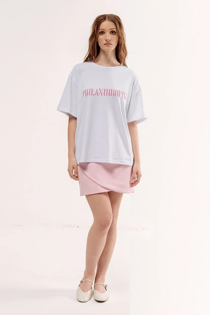 Майка свободного силуэта со спущенным рукавом. Характеристики: выполнена из трикотажного полотна в белом цвете, по переду розовая печать "PHILANTHROPIST", по горловине обработана планка, рукав укороченный. Длина майки по переду 59 см, длина рукава 22 см.