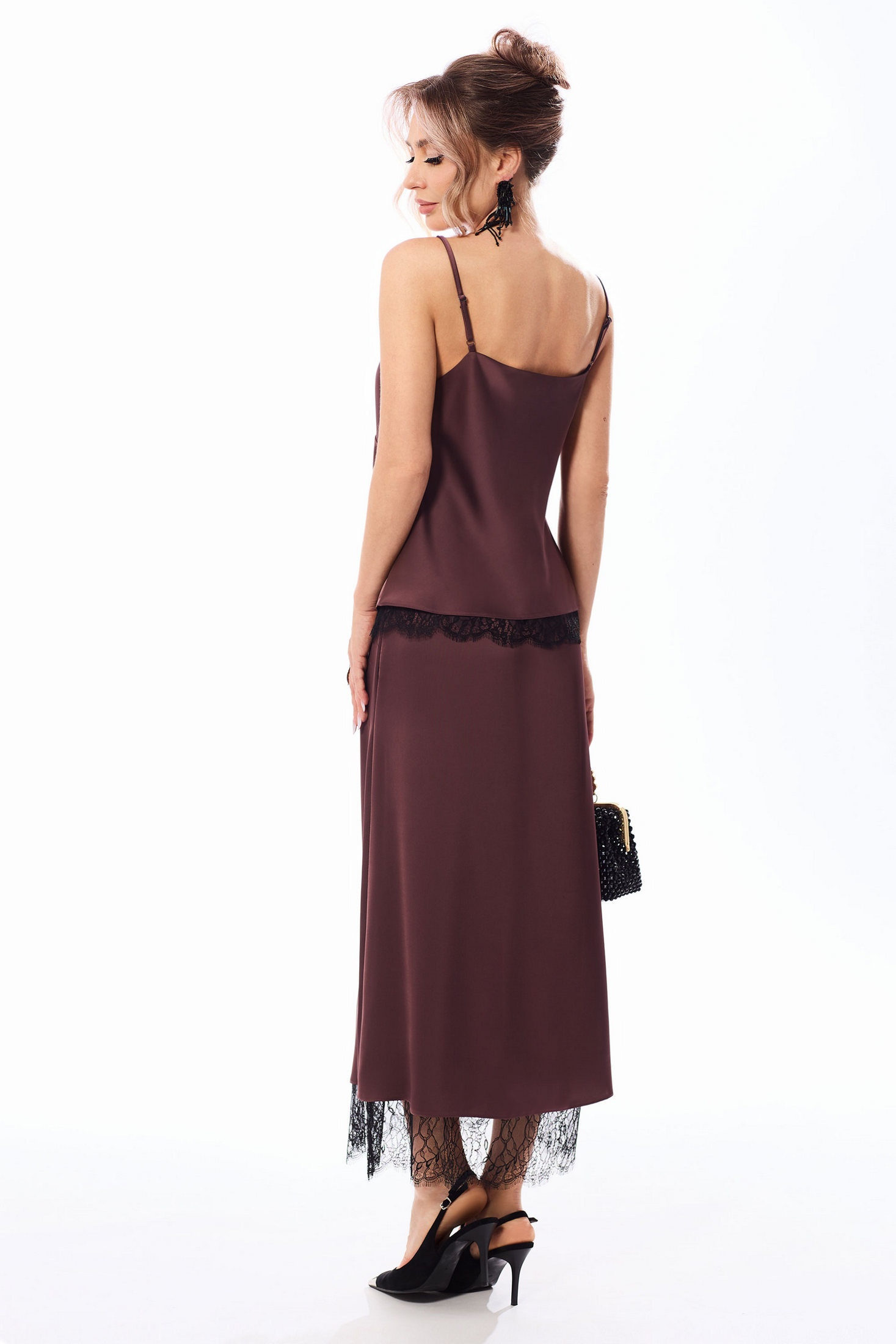 Топ на бретелях с регуляторами, с фигурным вырезом горловины. По переду с отрезными чашками. Горловина переда и низ топа декорированы кружевом. Силуэт: прямой. Цветовая гамма для верха, подкладки, фурнитуры, отделки: топ из эластичной ткани в одной цветовой гамме. Тип ткани: текстильный, костюмно – плательный.