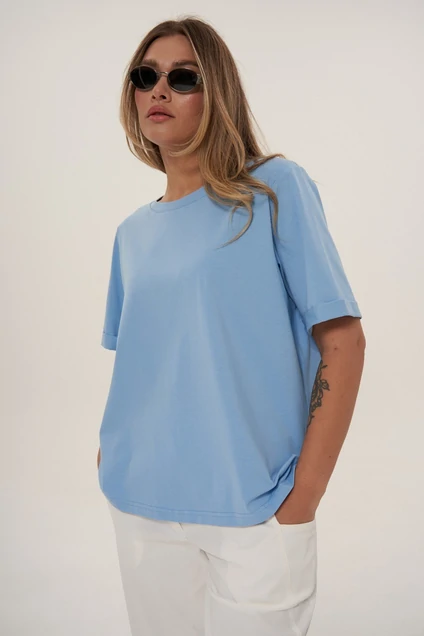 Модель имеет свободный крой oversize. Рукав свободный, с отворотом. Горловина округлая, обработана планокой. За счёт прямого кроя, футболка одинаково стильно смотрится на разных типах фигуры. Выполнена из хлопкового трикотажного полотна высокого качества, приятная к телу. Она обладает всеми необходимыми для идеальной вещи свойствами: сохраняет форму, неприхотлива в уходе: можно стирать в машинке на деликатном режиме.