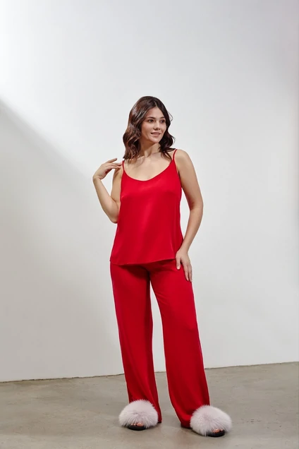 Топ выполнен из шелковистой вискозы. Чтобы наши изделия приносили Вам удовольствие как можно дольше, рекомендуем стирать их при максимальной температуре 30°С на укороченном режиме без использования отбеливателя и без применения сушки в барабане, гладить при температуре не более 150°С на изнаночной стороне.