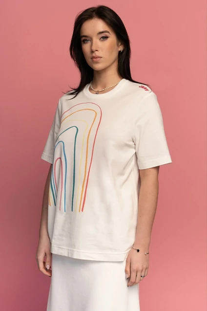 Джемпер(футболка) из трикотажа прямого силуэта с рукавом рубашечного типа.Принт радуга,на плече логотип бренда.