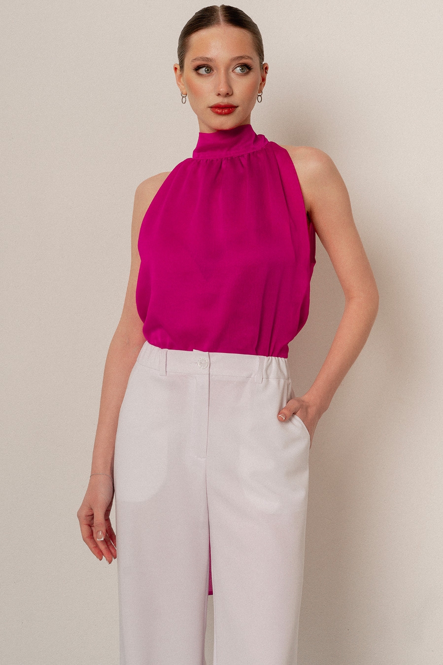 Топ женский молодежный из ткани шифон ,без застежки прямого силуэта ,с завязкой воротника бант по спинке.Перед и спинка двойные. По переду сборка по линии горловины,форма проймы реглан.Воротник шарф. Длина спинки 62 см