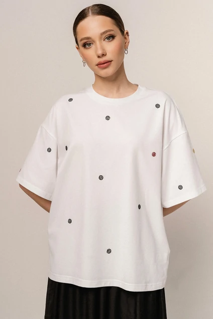 Этот молодежный женский джемпер в едином размере выполнен из мягкого трикотажного полотна (кулирки), что обеспечивает комфорт в носке. Модель имеет прямой, объемный силуэт с изящно спущенными рукавами и удобной округлой линией горловины. Футболка представлена в универсальном белом цвете, декорирована стильными принтами в виде горошка из страз, которые равномерно расположены по передней части и рукавам. Длина изделия составляет 68 см, ширина по линии груди и бедер — 58 см, что соответствует размерному ряду 42-46. Длина рукава — 20 см, а плеча — 23 см. Этот джемпер станет прекрасным дополнением к гардеробу тех, кто ценит комфорт и стиль.