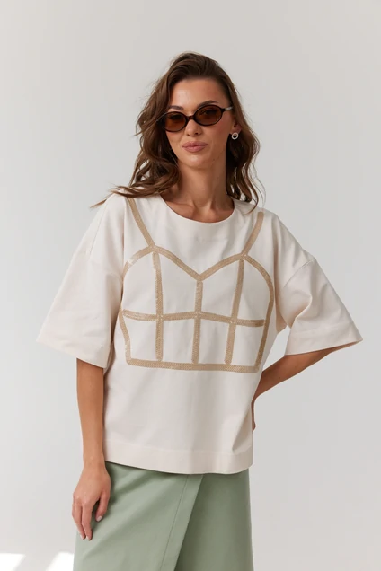 Блузка женская, прямого силуэта. Перед цельнокроеный, декорирован авторской вышивкой пайетками. Спинка цельнокроеная. Плечо спущено. Рукав притачной с манжетой длиной ниже локтя. Горловина округлой формы, обработана обтачкой, отстрочена. Декоративные элементы и фурнитура могут отличаться от заявленных на фото. Цвет материала может отличаться по тону в зависимости от настроек вашего монитора! Длина изделия по спинке 61 см. Длина рукава от горловины 58 см.
