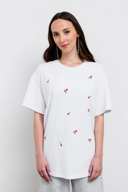Удлиненная белая блузка с коротким рукавом и круглой горловиной - универсальная вещь для повседневной носки. По переду нанесена вышивка в виде "россыпи мелких цветов"