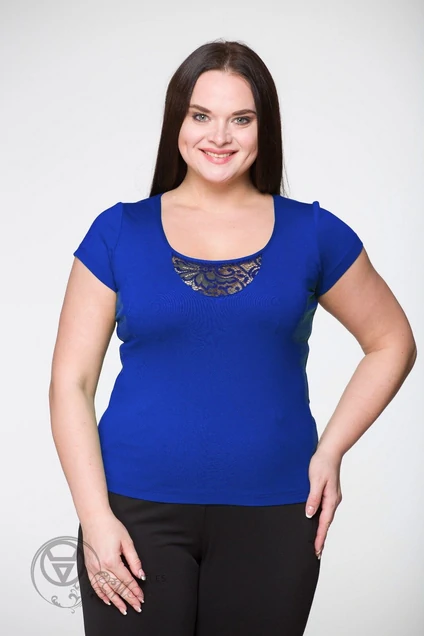 Блузка полуприлегающего силуэта из трикотажного полотна, вставка из гипюра. Длина изделия 59 см.