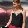 Топ прямого, выполнен из блузочной ткани. По переду надстрочное кружево. Блуза на регулируемых бретелях.