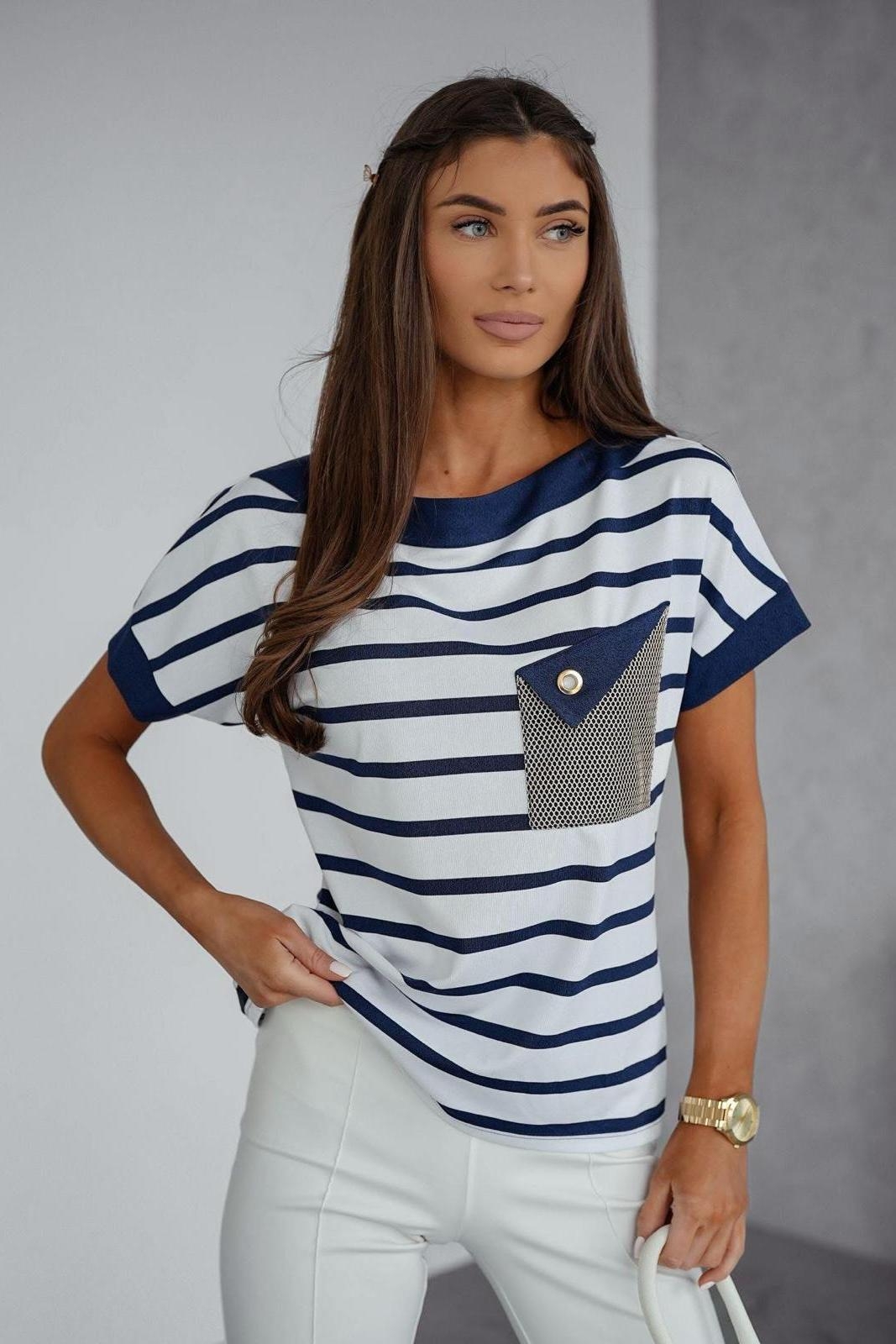 Блузка женская повседневная выполнена из мягкого трикотажа с добавлением вискозы, что делает ее не только стильной, но и комфортной в носке. Прямой силуэт блузки подчеркнет достоинства вашей фигуры. На груди блузка украшена потрясающим "сеткой-карманом" и тесьмой, что придает ей особый шарм. Круглый вырез горловины делает модель универсальной и подходящей для любого случая. Спина однотонная, без полос, что создает элегантный и захватывающий вид.