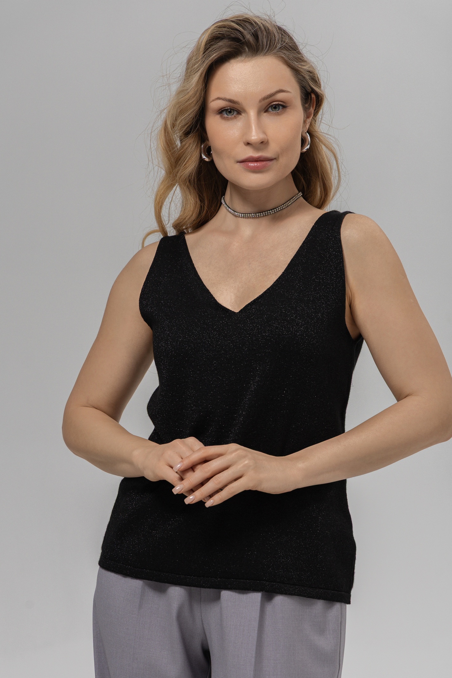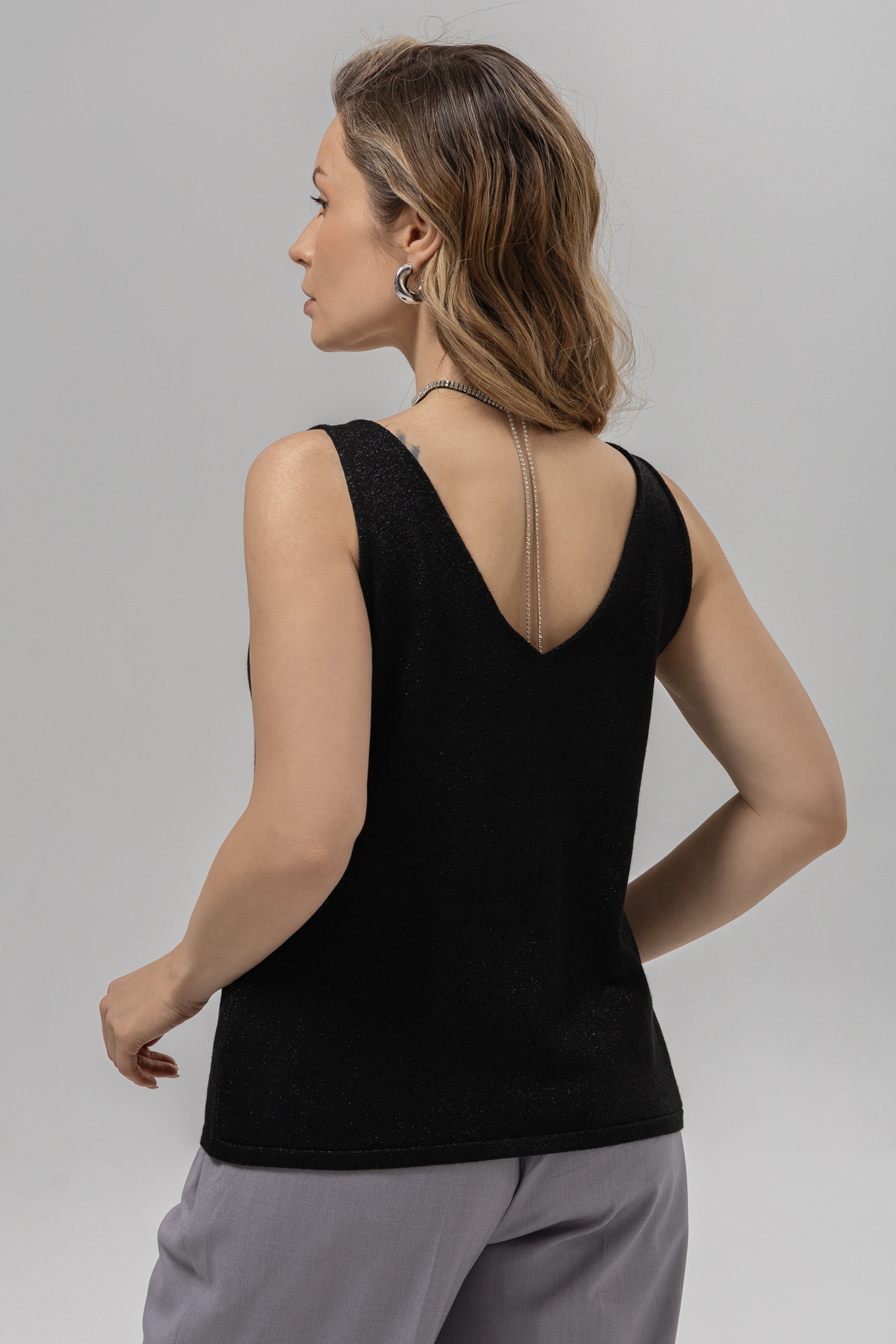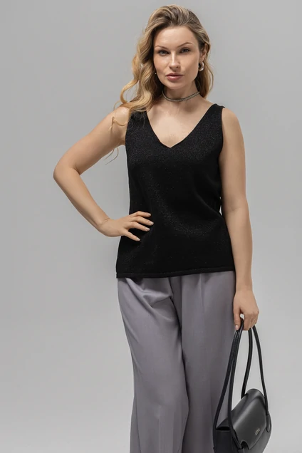 Дизайн: топ без рукавов с V-образным вырезом, что придаёт изделию женственность и стиль. Простой, но изысканный крой подчёркивает фигуру;