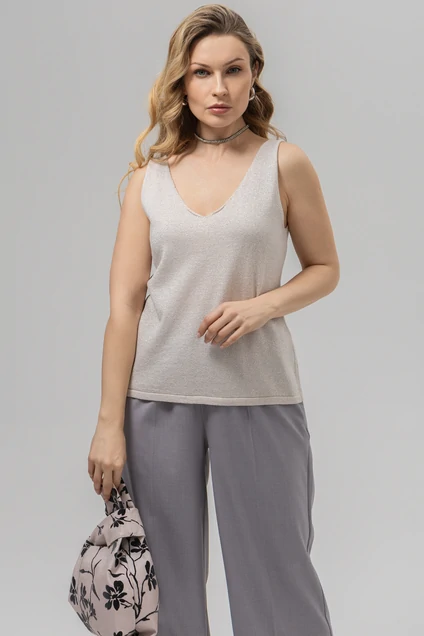 Дизайн: топ без рукавов с V-образным вырезом, что придаёт изделию женственность и стиль. Простой, но изысканный крой подчёркивает фигуру;