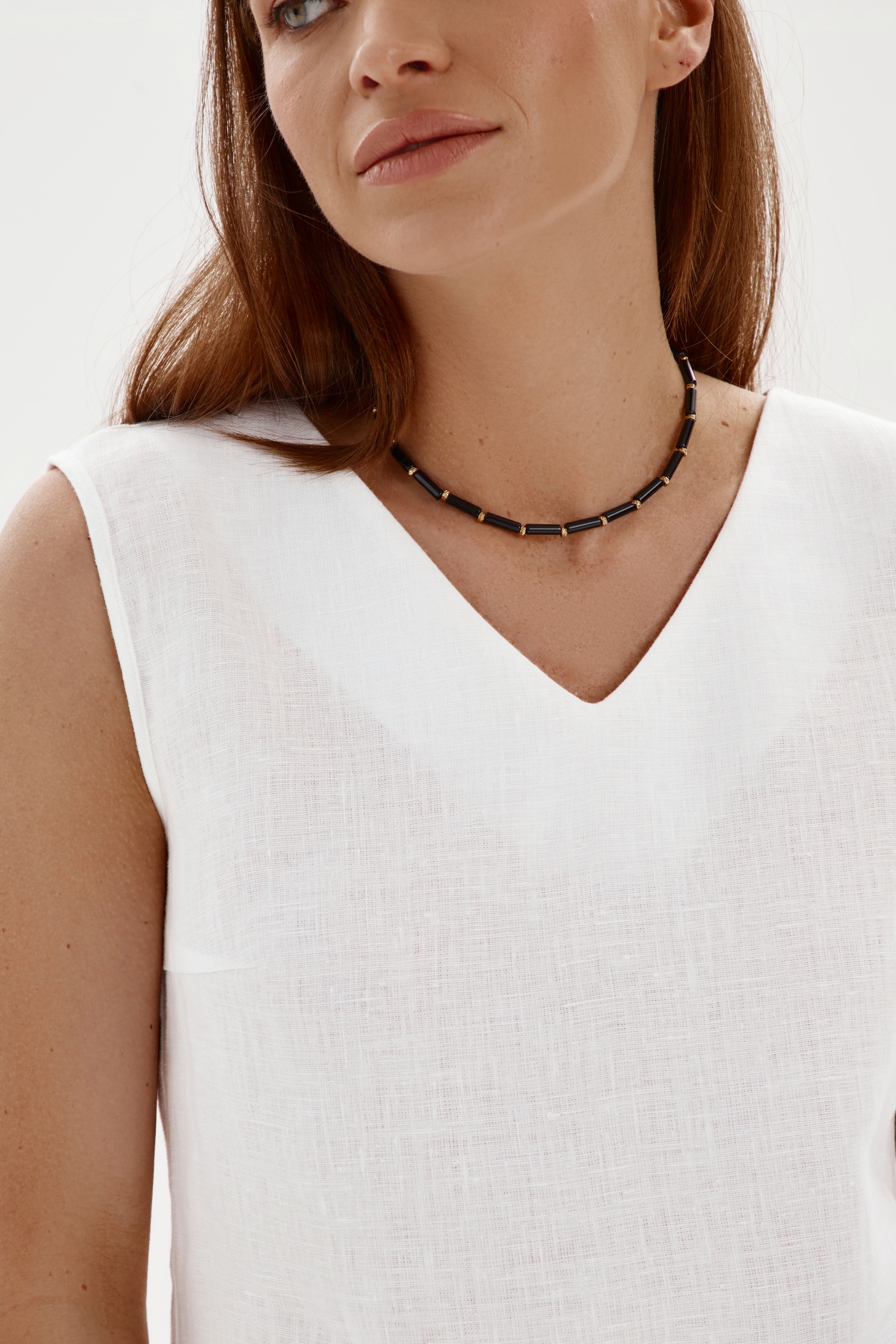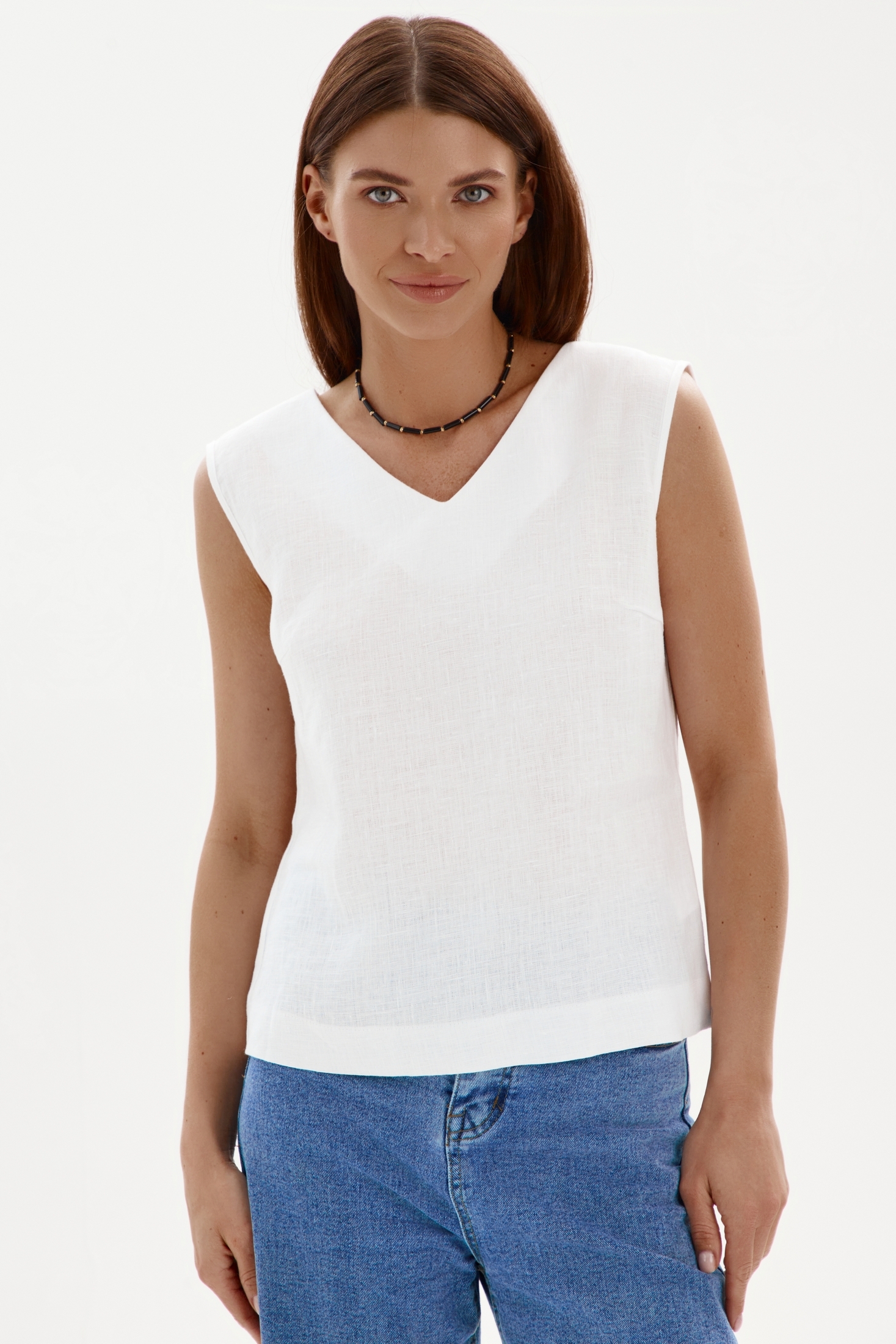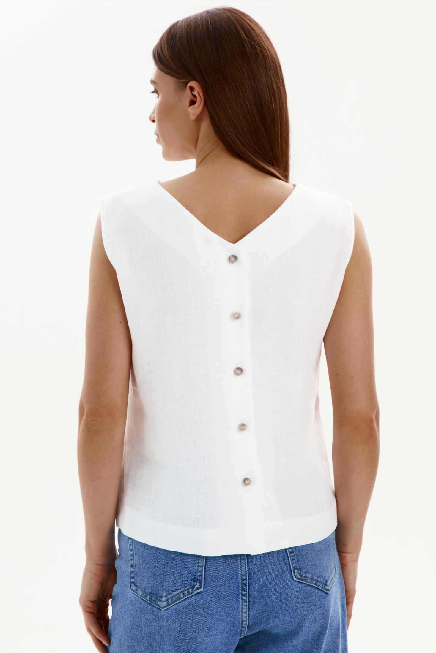 Элегантная блузка без рукавов, выполненная в стильном белом цвете, представляет собой идеальное сочетание комфорта и изящества. Прямой крой делает этот предмет одежды идеальным выбором для любого случая, обеспечивая свободу движений и стильный внешний вид. Дизайн с пуговицами на спине добавляет изысканную деталь, придающую этой блузке уникальный акцент. Лаконичность кроя и отсутствие рукавов делают ее отличным выбором для теплой погоды. Эта блузка - идеальный выбор для создания лаконичного, но выразительного образа.