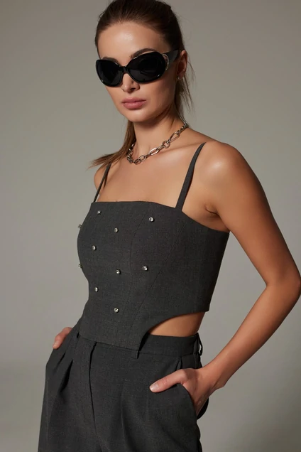 Топ (корсет) на бретелях с фигурным вырезом низа. Прилегающий силуэт, на подкладке, по передней части изделия рельефы, и пришивные стразы в качестве декора. По центру спинки металлическая застежка-молния. Изделие выполнено из премиальной костюмной ткани, станет стильным, острым и элегантным дополнением к современному образу. Длина топа по центру переда 29,5 см. Длина по боковому шву 16 см. Длина по центру спинки 15 см.