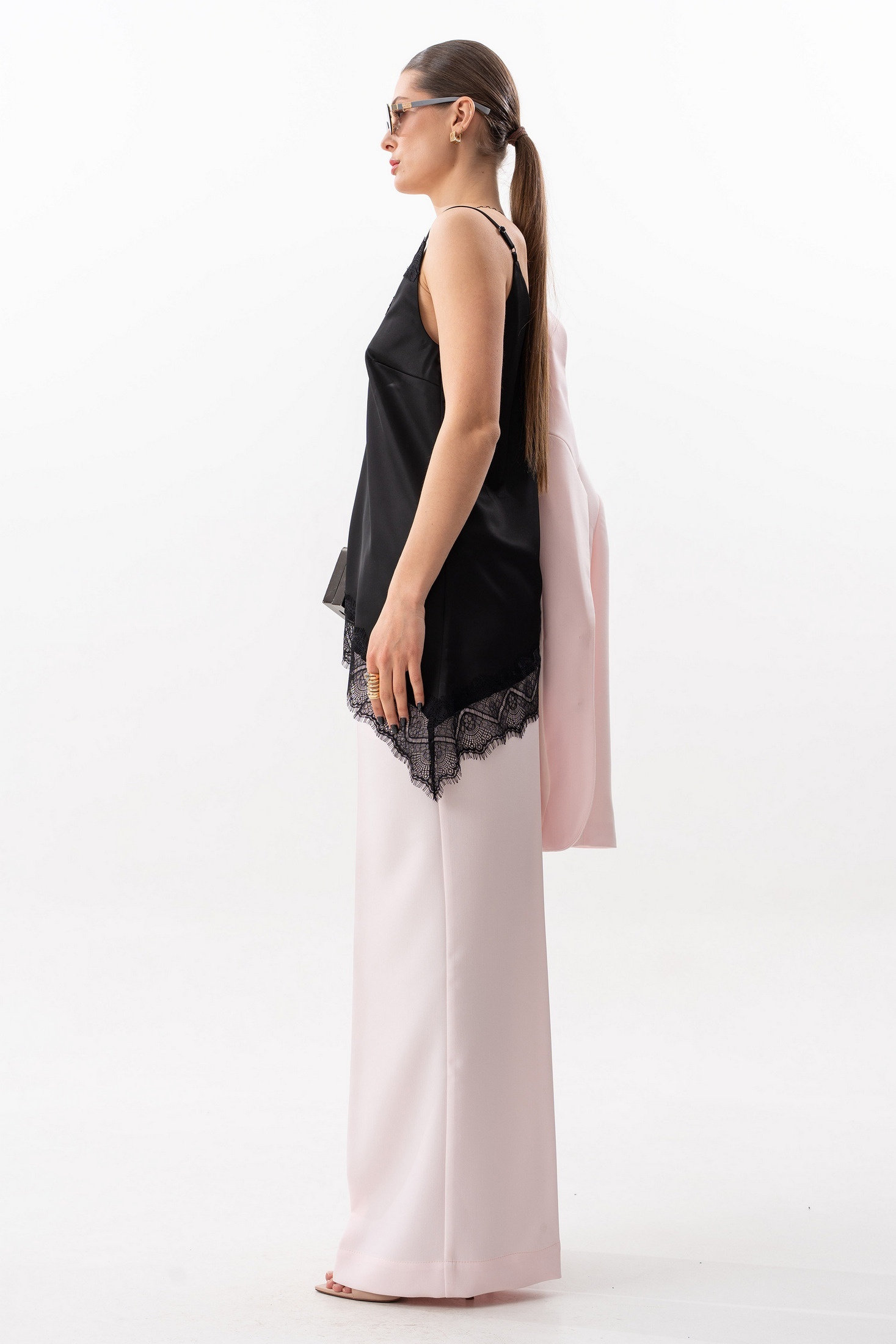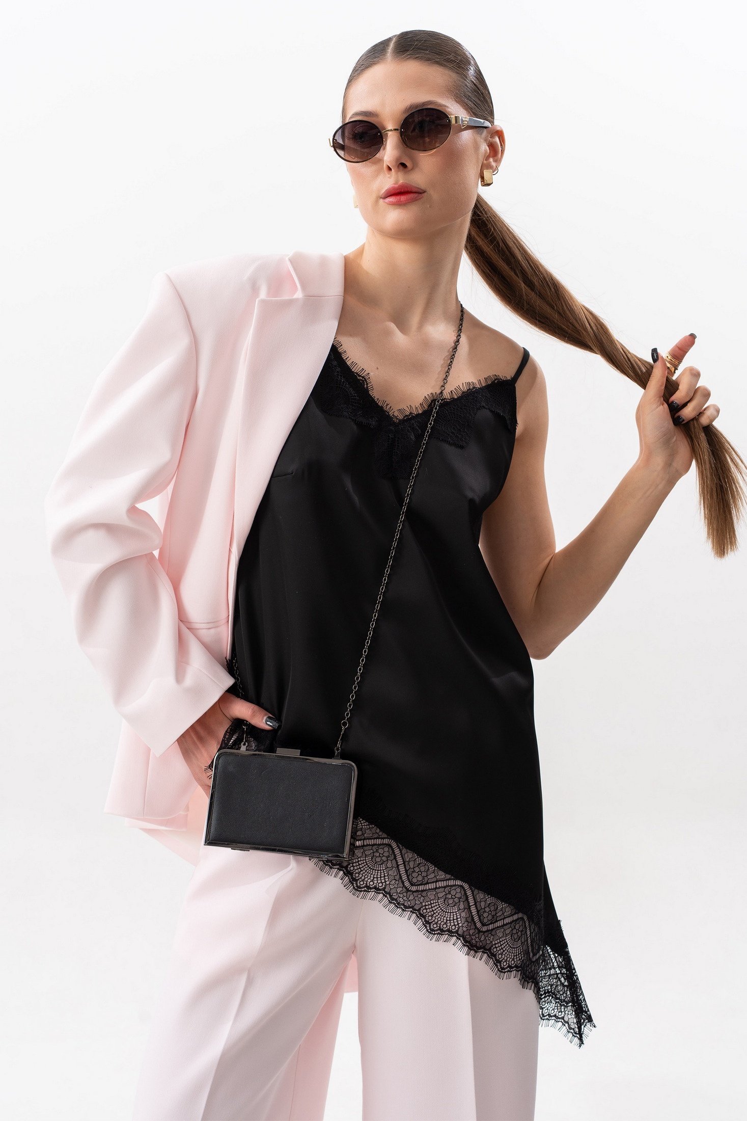Топ "комбинация", свободного силуэта, с нагрудными вытачками. Линия декольте переда и низа декорированы "французским" кружевом. Линия низа ассиметричная. Регулируемые бретели обеспечивают идеальную посадку и комфорт при носке. Шелковистая ткань делает образ стильным и завораживающим. Длина топа по правому боковому шву от проймы +- 33 см. Длина топа по левому боковому шву от проймы +-65 см. Параметры в готовом виде в 42-44-46 р.: обхват груди 90-94-98 см, обхват обхват бедер 98-102-106 см. Параметры в готовом виде в 48-50-52 р.: обхват груди 102-106-110 см, обхват обхват бедер 110-114-118 см. На фото: жилет S-2636, костюм S-1635