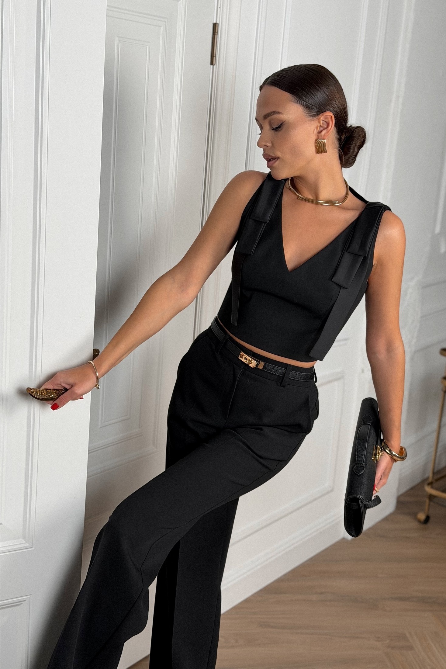 Женский укороченный топ — идеальный выбор для создания элегантного и нарядного образа. Выполнен из текстильной ткани на поливискозной подкладке. Вырез горловины V-образный. По плечевым швам декоративные детали из атласных лент. Топ без рукавов. Застежка на потайную молнию в среднем шве спинки. Этот топ станет роскошным дополнением к юбке или брюкам для любого праздничного мероприятия. На фото с брюками М380.