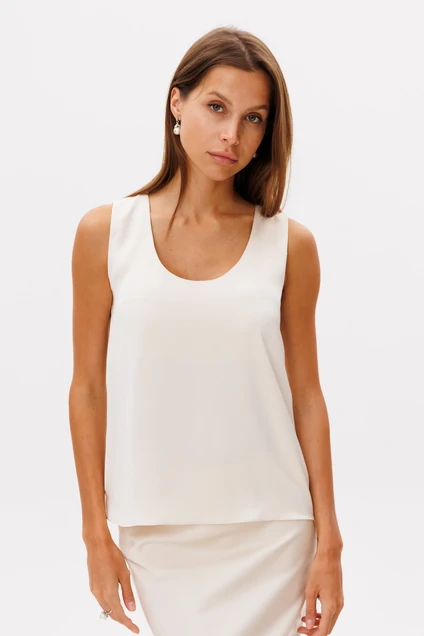 Базовый топ прямого кроя без рукава на обтачке по переду и спинке .Длина по спинке 58 см , по груди в 42-м размере 44 см. Выполнен из атласной ткани , подойдет как база под жакет, рубашку, для повседневного или офисного стиля.