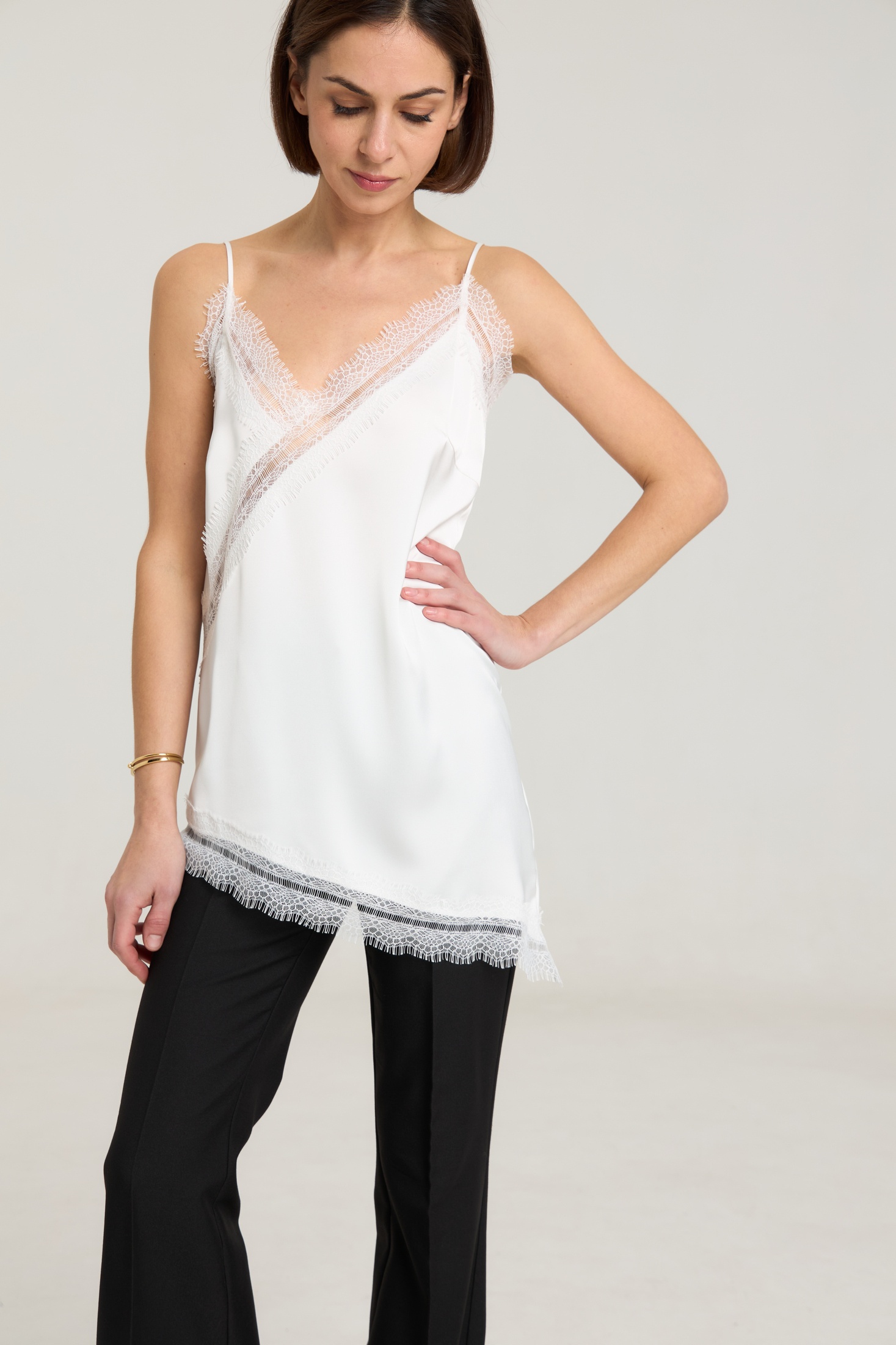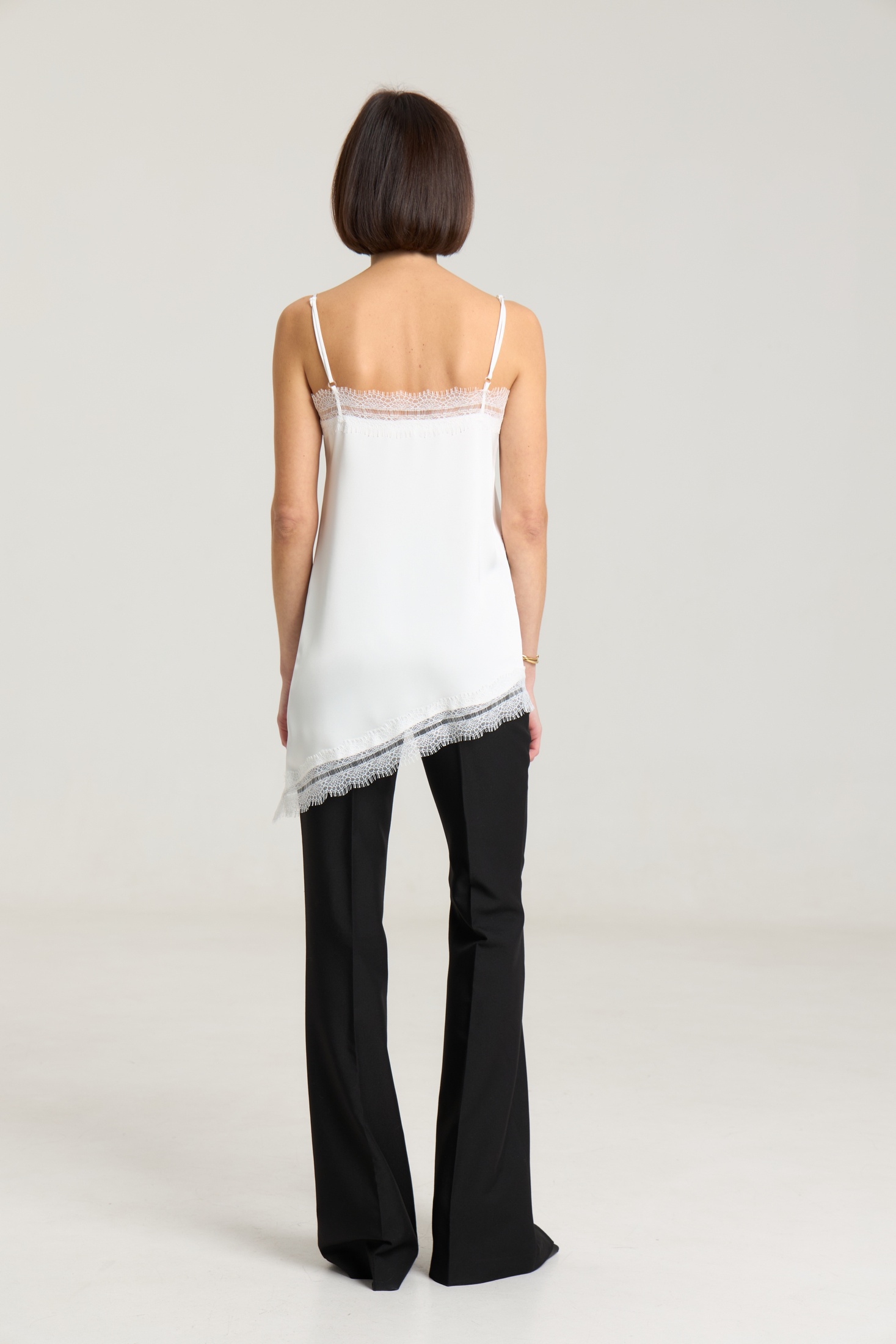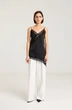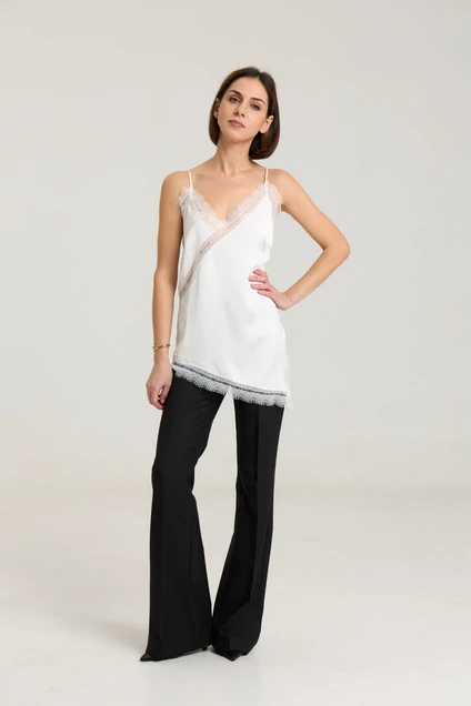 Ассиметричный топ с кружевом, топ на регулируемых бретелях, ширина кружева 7 см, длина топа 54 см. Топ станет дополнением к любому образу, будь то повседневный или нарядный. Можно сочетать с атласными черными брюками или юбкой из нашей коллекции. Атлас плотный, на груди выточки.