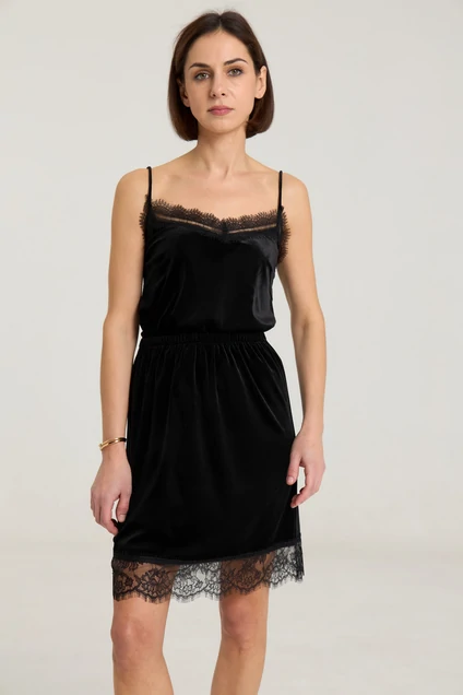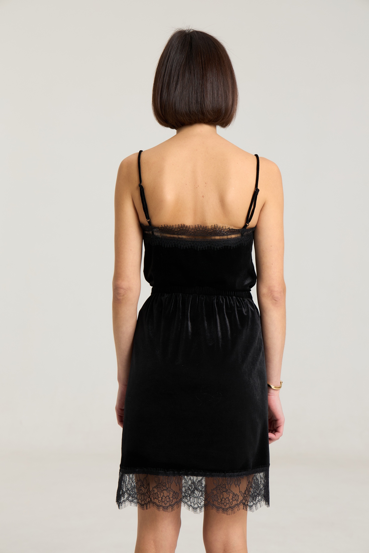 Элегантный черный топ-майка из мягкой велюровой ткани идеально подойдет для создания как повседневных, так и вечерних образов. Модель имеет полуприлегающий силуэт с регулируемыми бретелями, обеспечивая идеальную посадку. Изысканный акцент в виде тонкого кружева по краям передней и задней части добавляет нотку изящества. Длина изделия составляет 40 см включая кружево, а полуобхват груди в размере 42 составляет 40 см, что подчеркивает фигуру, сохраняя при этом комфортное ощущение.
