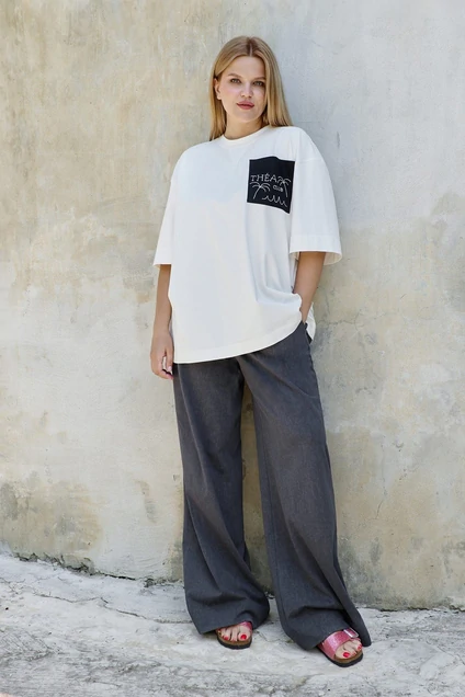 Футболка женская, оверсайз силуэта из хлопкового трикотажа с контрастным накладным карманом по переду. Футболка удлиненная , с коротким рукавом ниже локтя. Горловина с обработкой по внутреннему срезу по спинке хлопковой тесьмой . Накладной карман с вышивкой с иммитацией ручного стежка. Хорошо комплектуется с брюками , юбками