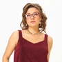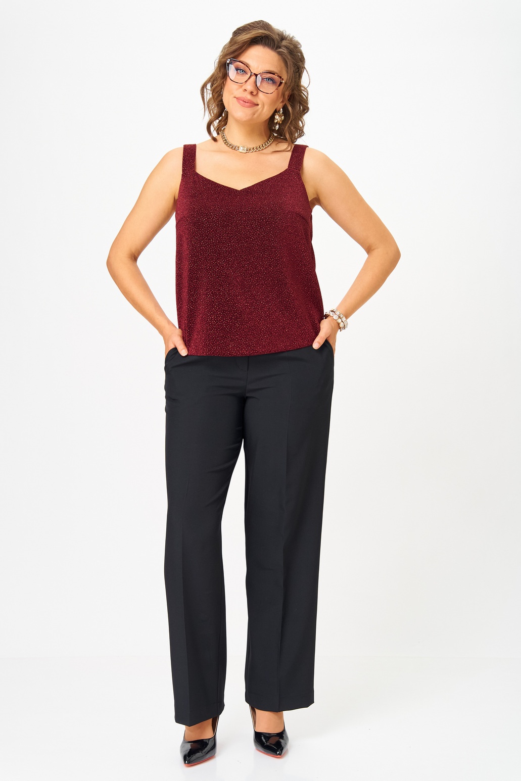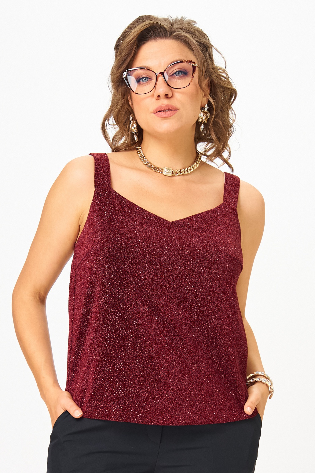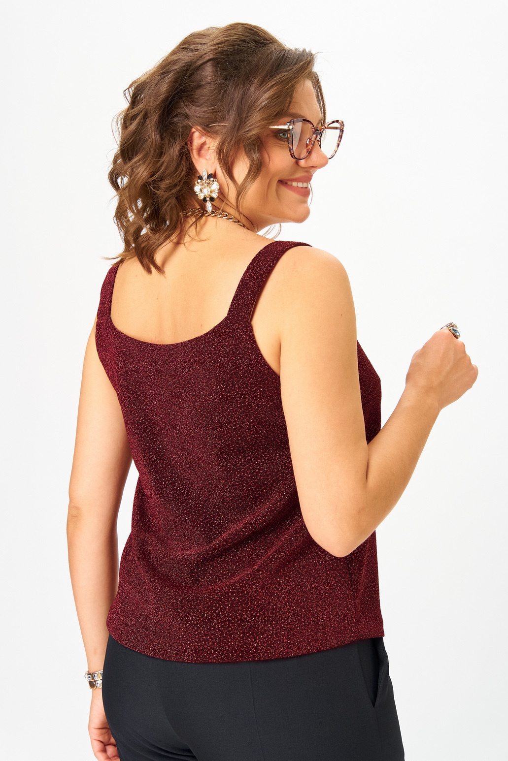 Этот топ сияющего бургундского цвета с добавлением блестящего люрекса станет вашим идеальным выбором для праздничного мероприятия. Прямой силуэт на широких бретелях подчеркивает линию плеч и обеспечивает комфортное прилегание. Лёгкая V-образная горловина эффектно выделяет зону декольте, делая акцент на изяществе образа. Нагрудные вытачки на передней части топа обеспечивают идеальную посадку, а цельнокроеная спинка добавляет гладкости и единообразия конструкции. Трикотажное полотно с люрексом не только приятно смотрится, но и комфортно носится.