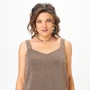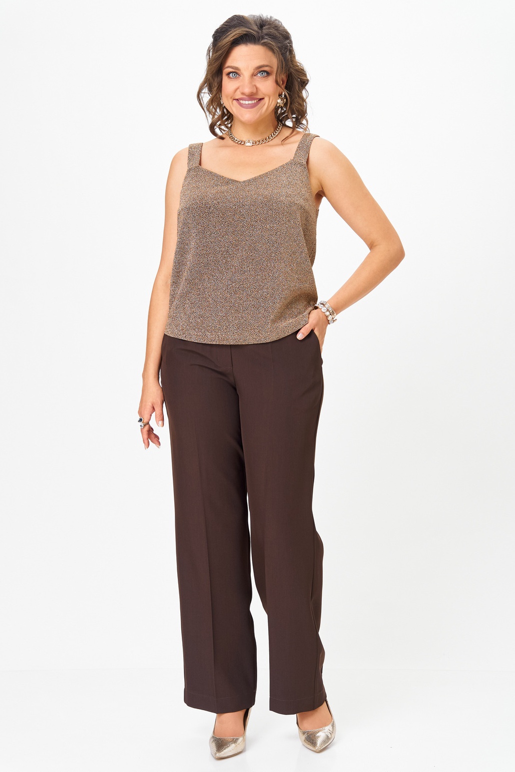Топ прямого силуэта на широких бретелях, выполнен из трикотажного полотна с люрексом. Перед с нагрудными вытачками. Горловина переда лёгкой V-образной формы. Спинка цельнокроеная.