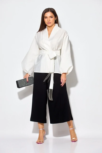 Туника женская прямого силуэта из текстильной ткани со спущенной линией плеча. С ее помощью легко можно трансформировать повседневный образ в праздничный. Идеально сочетается с брюками , юбкой , платьем. Рукав двойной, расширенный к низу со складками. По спинке и полочке идет планка. В комплекте с туникой идет съемный пояс. Длина спинки(48-56)-66 см. Длина рукава: (48-56)-53см.